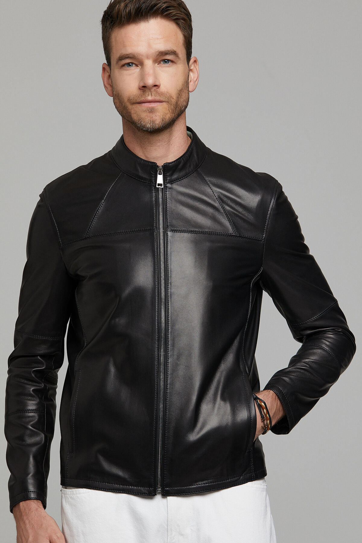 کاپشن چرمی کوتاه مردانه مشکی طرح اسلیم فیت نیمار دارای چرم گوسفند است.