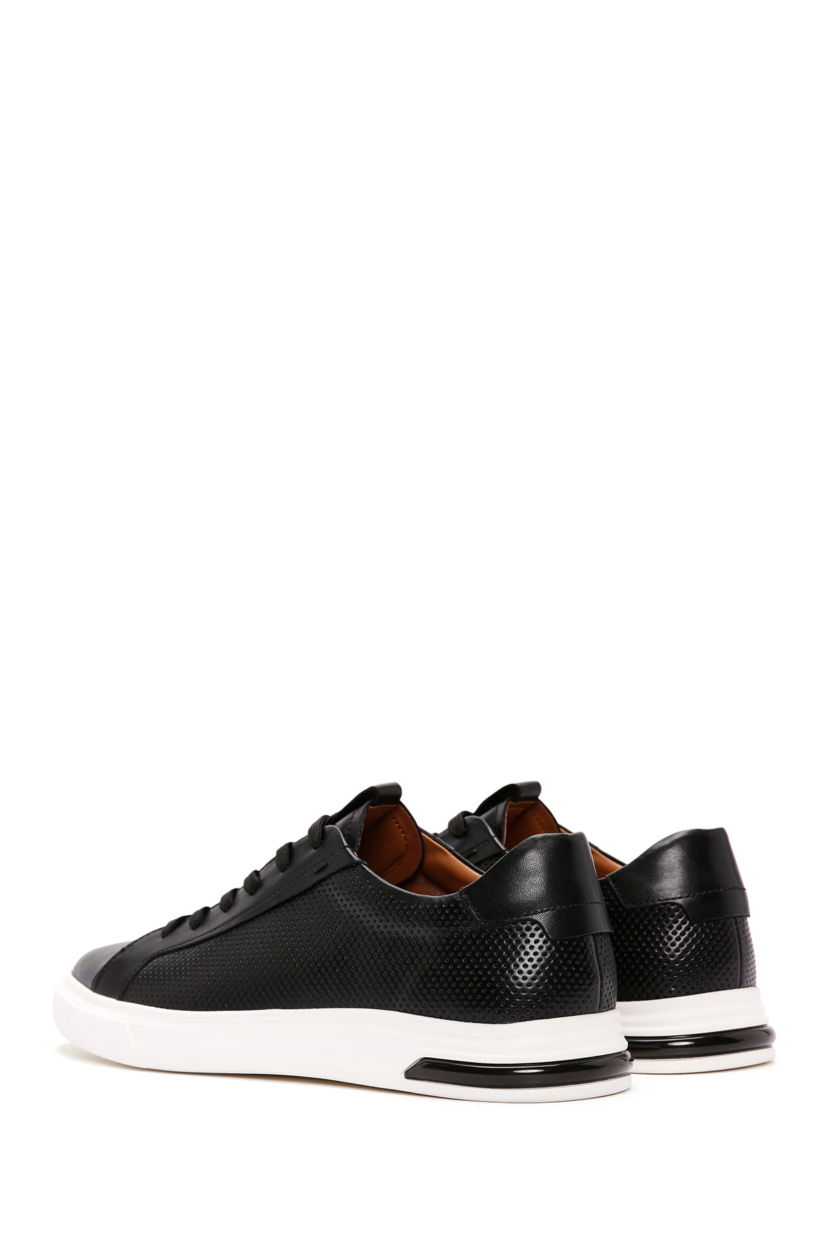 این کفش کتانی مردانه چرمی مشکی بنددار، دارای چرم گاوی است.