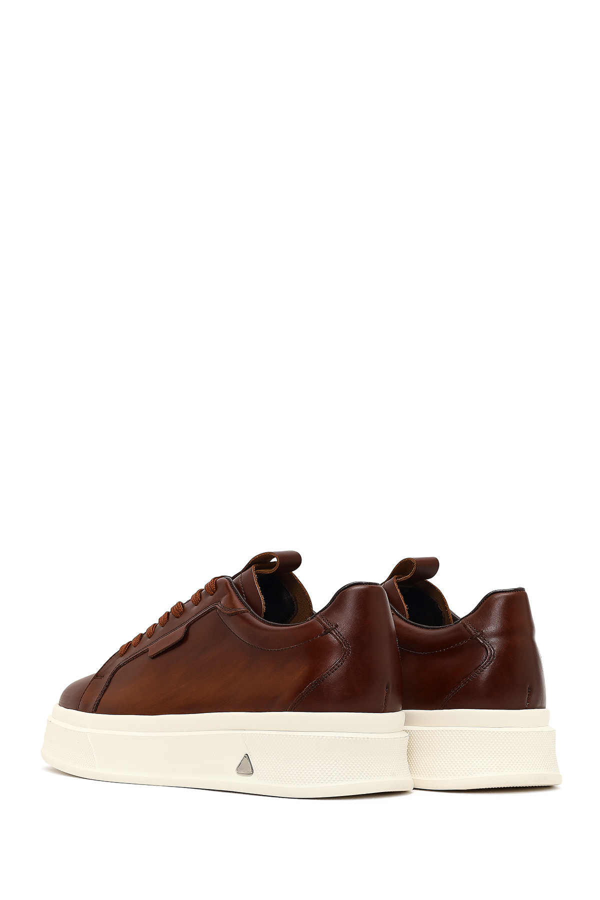 کفش کتانی مردانه چرم قهوهای بنددار با کفی ضخیم، دارای چرم گاوی.