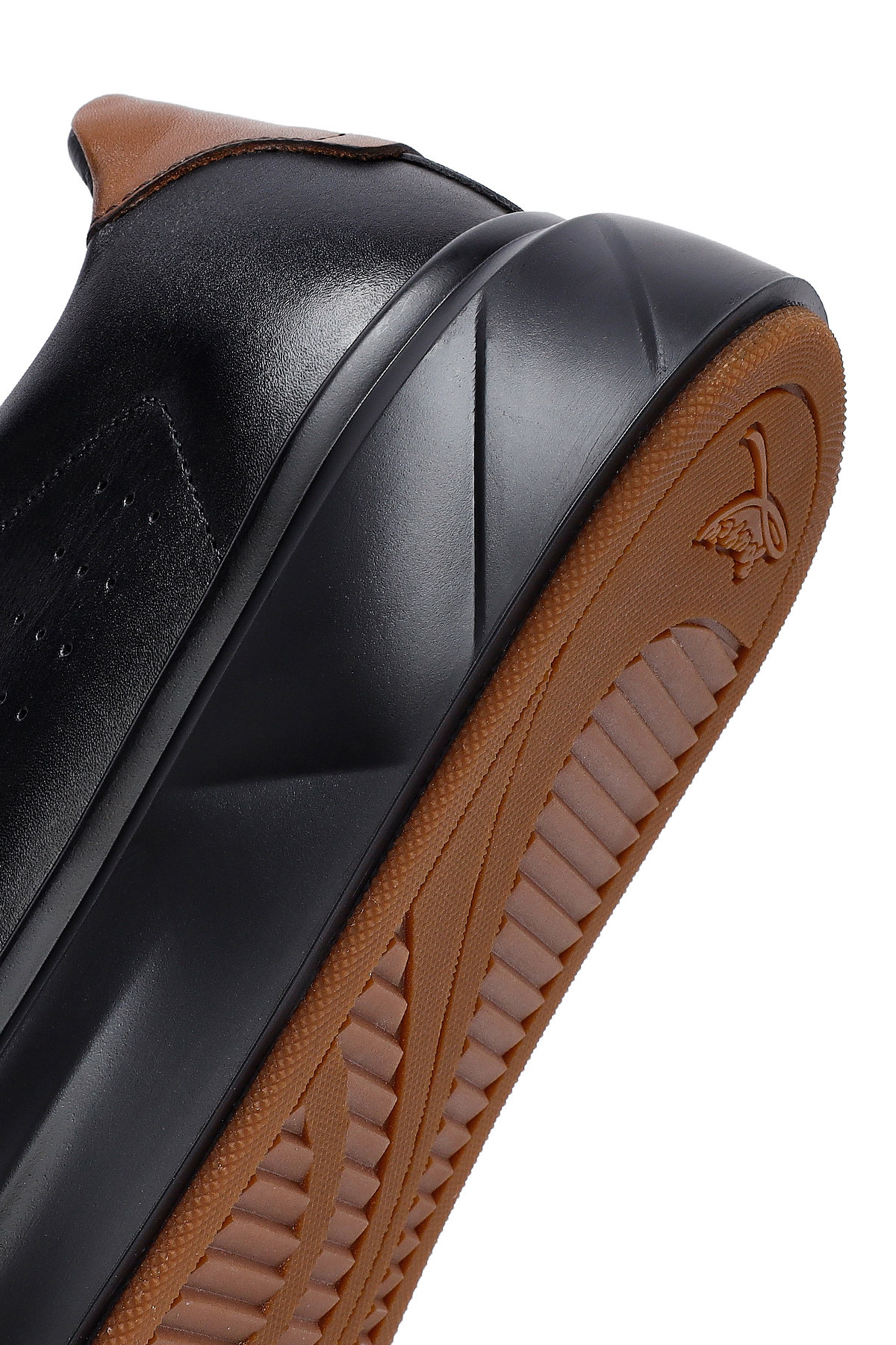 این کفش کتانی مردانه مشکی بنددار و چرمی با کفی ضخیم، دارای چرم گاوی است.