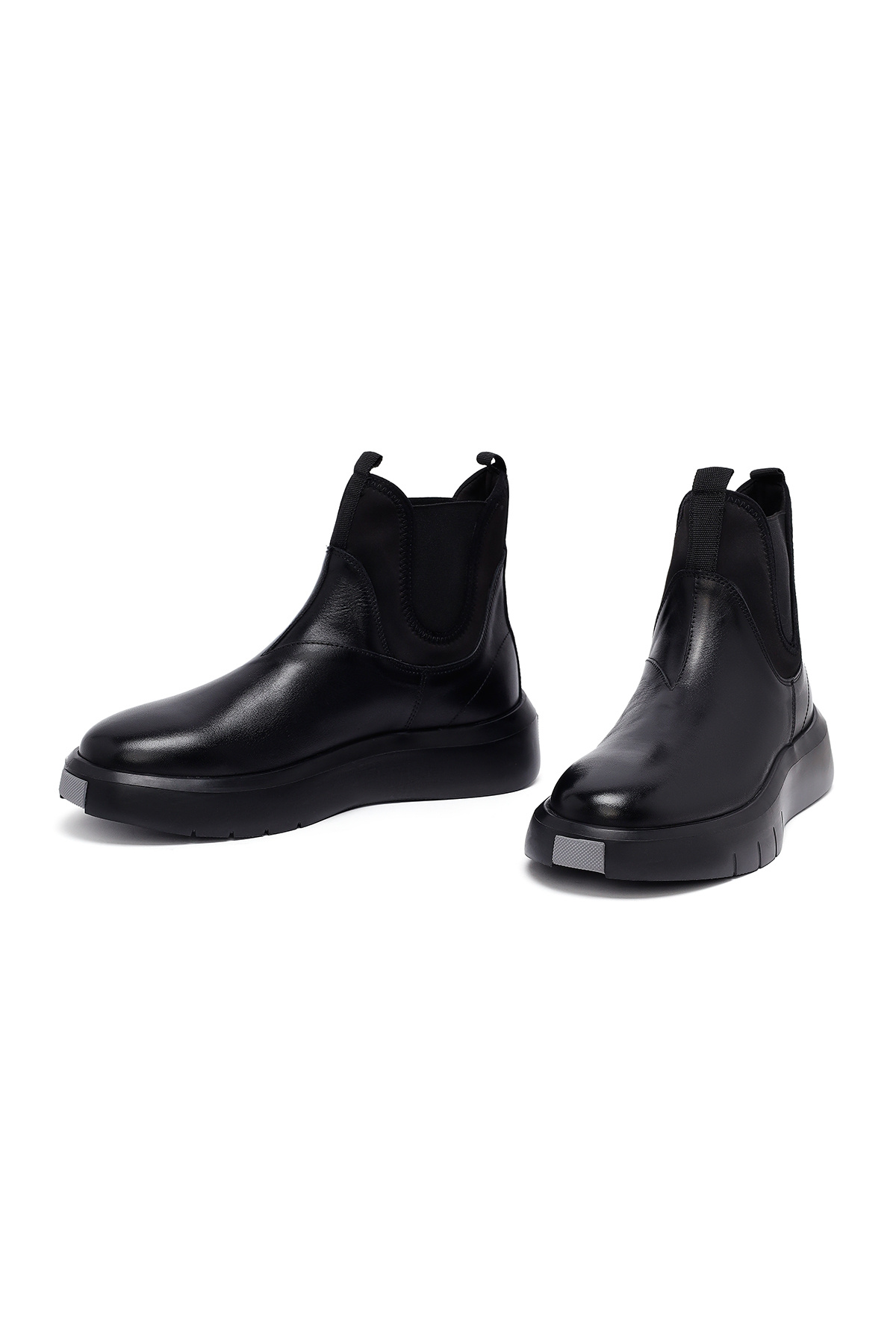 چکمههای چلسی مردانه با زیره ضخیم مشکی، دارای چرم گاوی هستند.