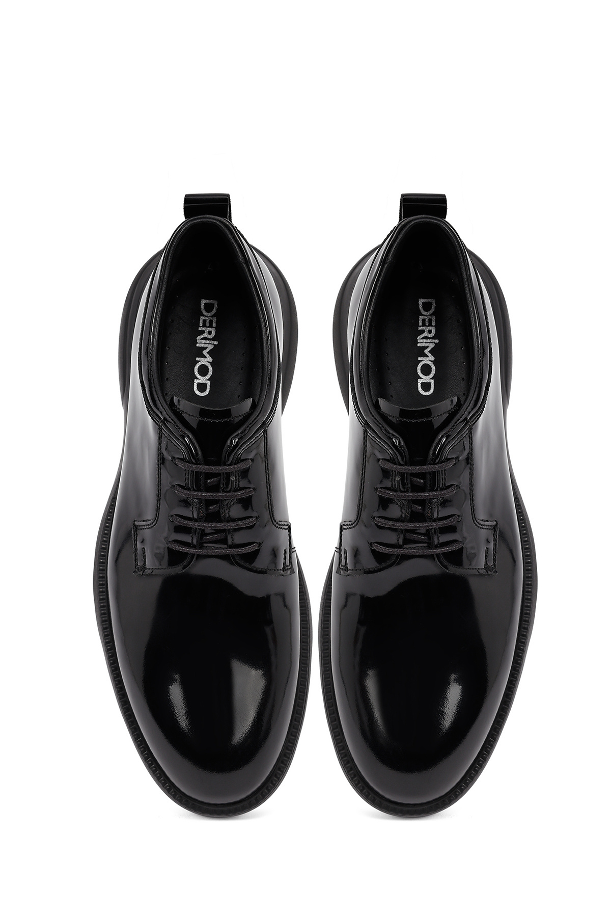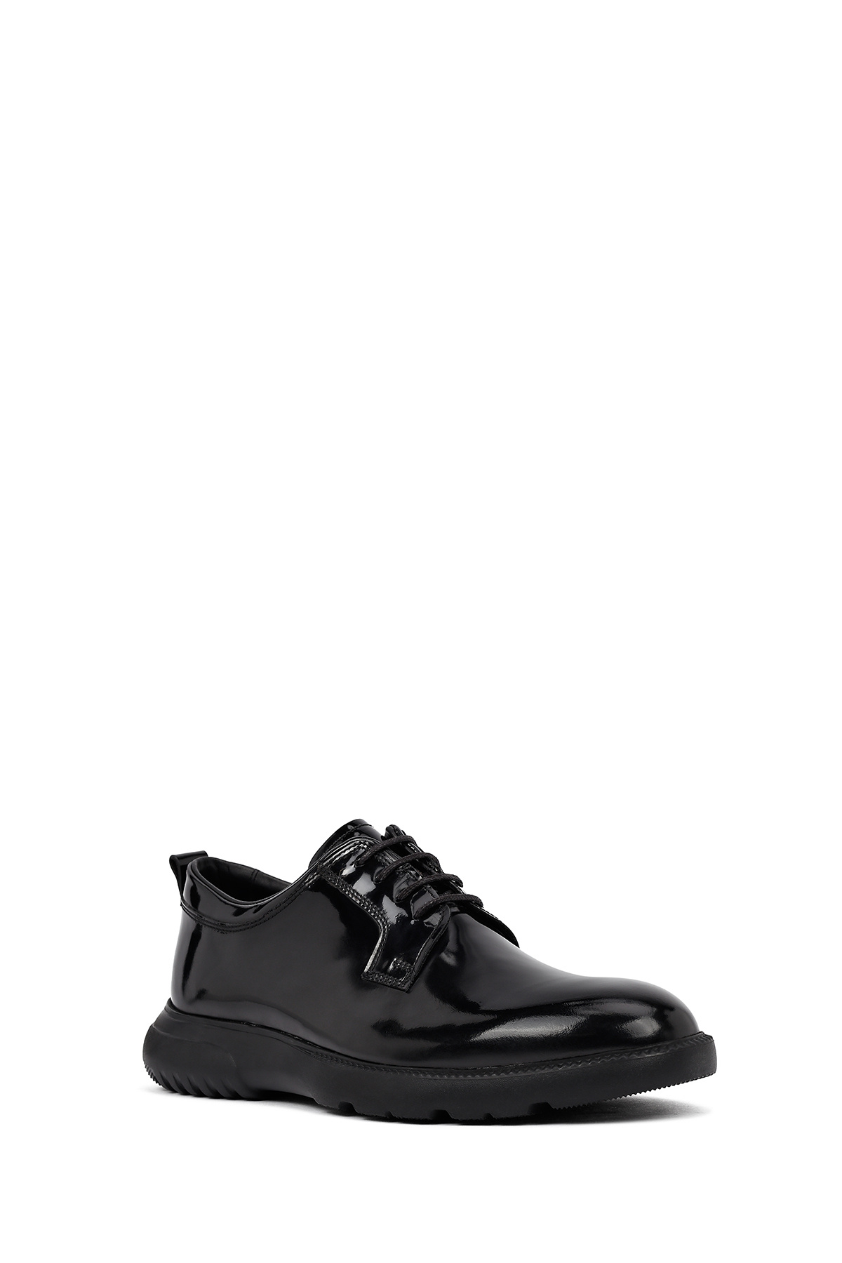 کفشهای راحتی مردانه چرمی مشکی بنددار با کفی ضخیم، دارای چرم گاوی هستند.