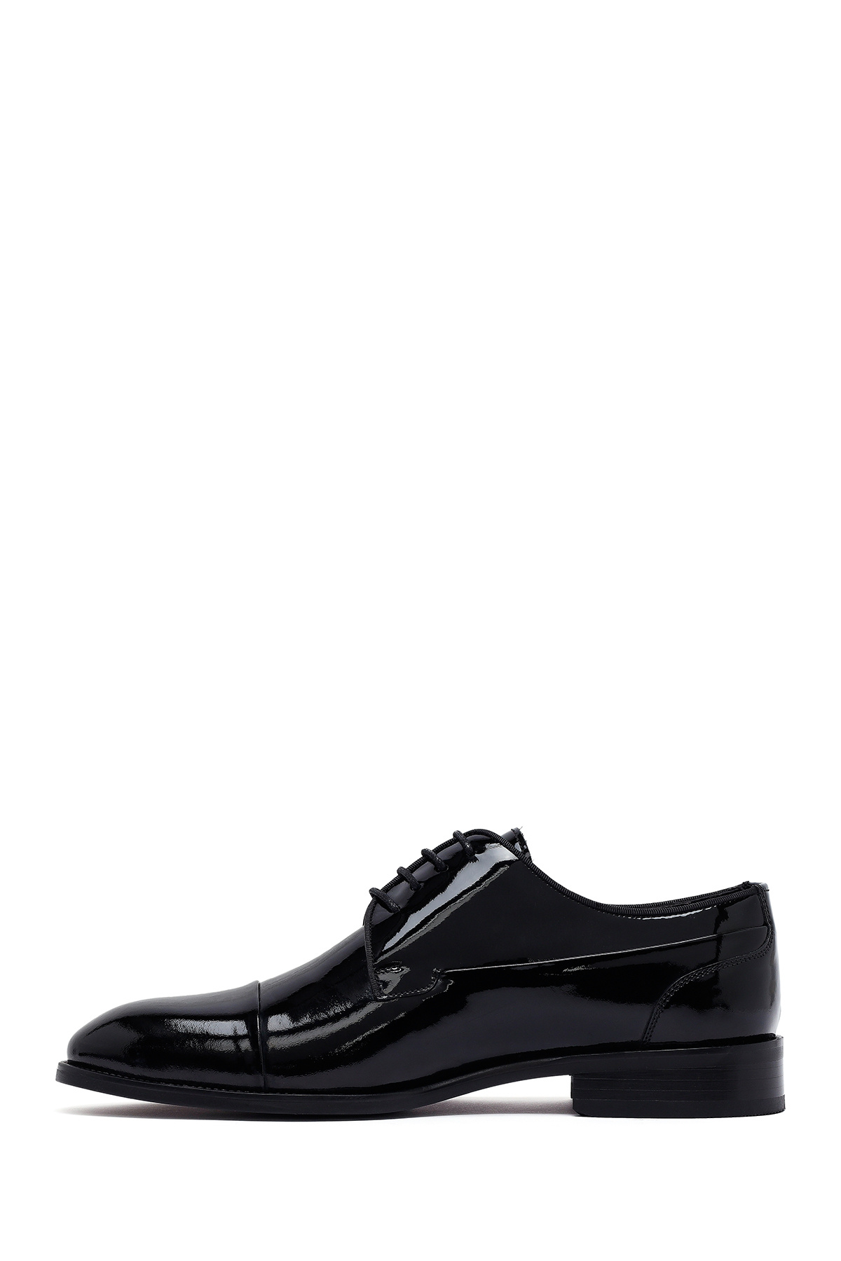 کفشهای کلاسیک چرم ورنی مشکی مردانه با بند، دارای چرم گاوی هستند.