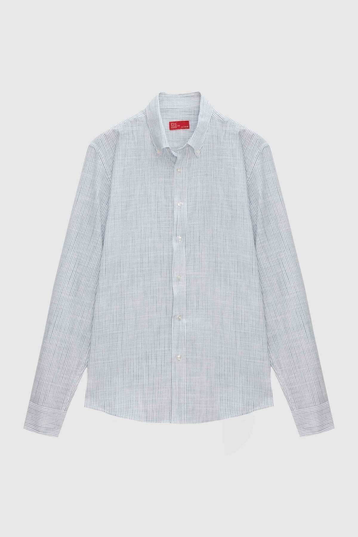 خرید اینترنتی پیراهن تابستانی کتانی طرح شعلهور، یقه دکمهدار راهراه باریک آبی، اسلیم فیت برند دی اس دامات D’S Damat اورجینال از DS DAMAT نمایندگی و فروشگاه معتبر ترکیه