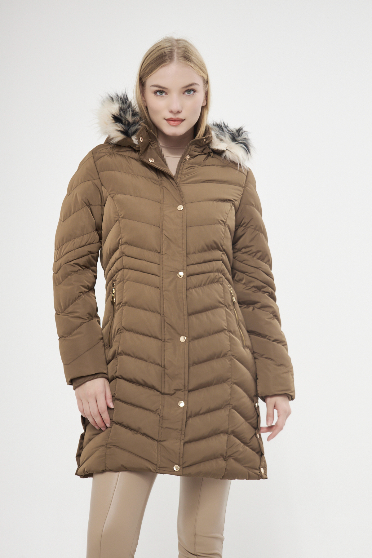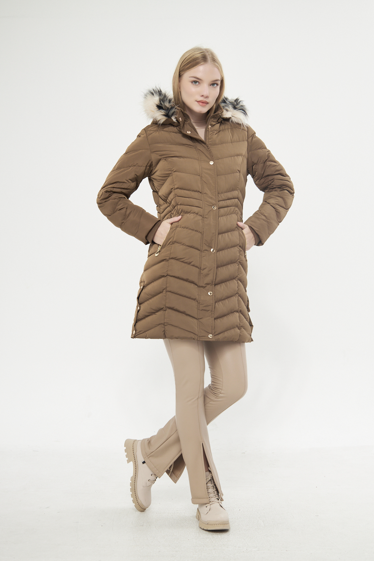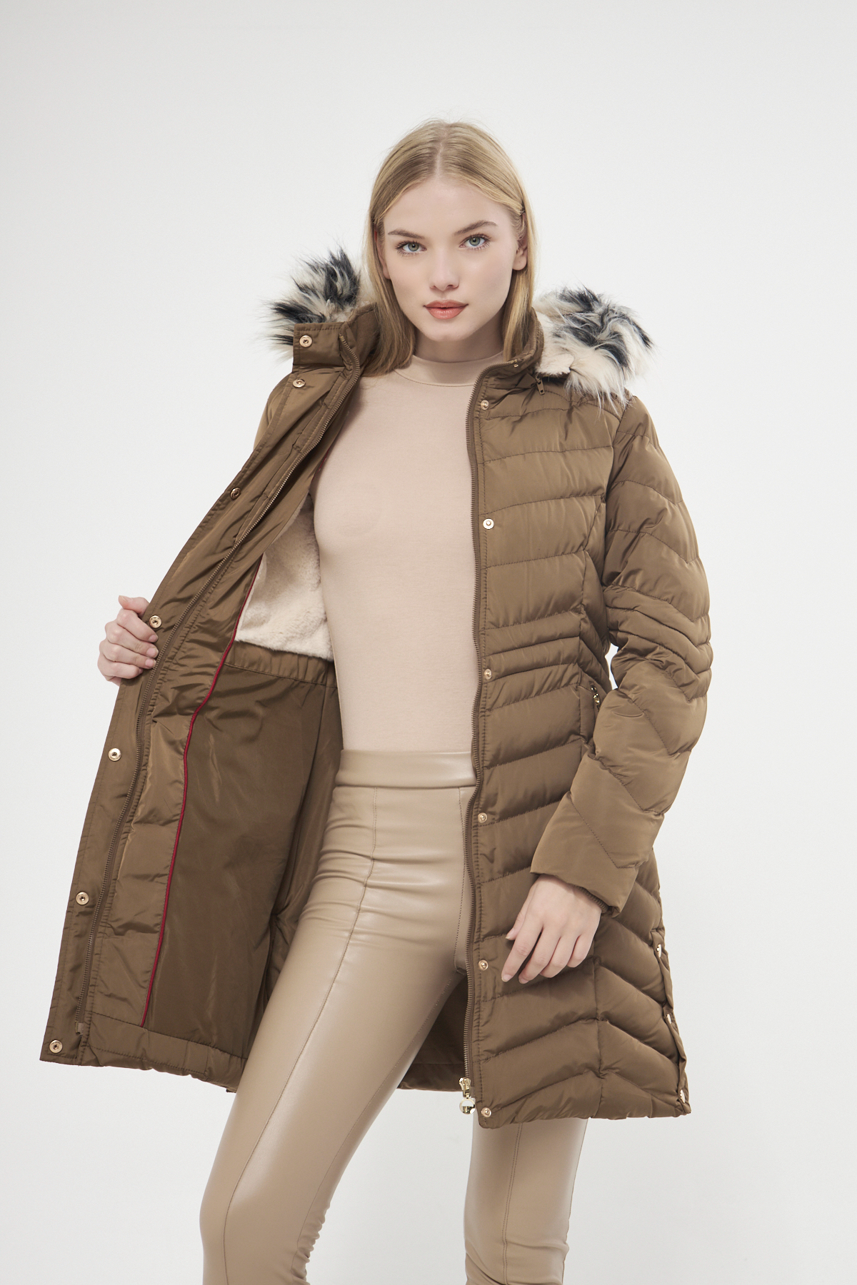 خرید اینترنتی پالتو زنانه ضخیم قهوهای روشن با کلاه جداشونده و آستر خزدار ۵۳۰۲ برند دینامو Dynamo اورجینال از DYNAMO نمایندگی ترکیه