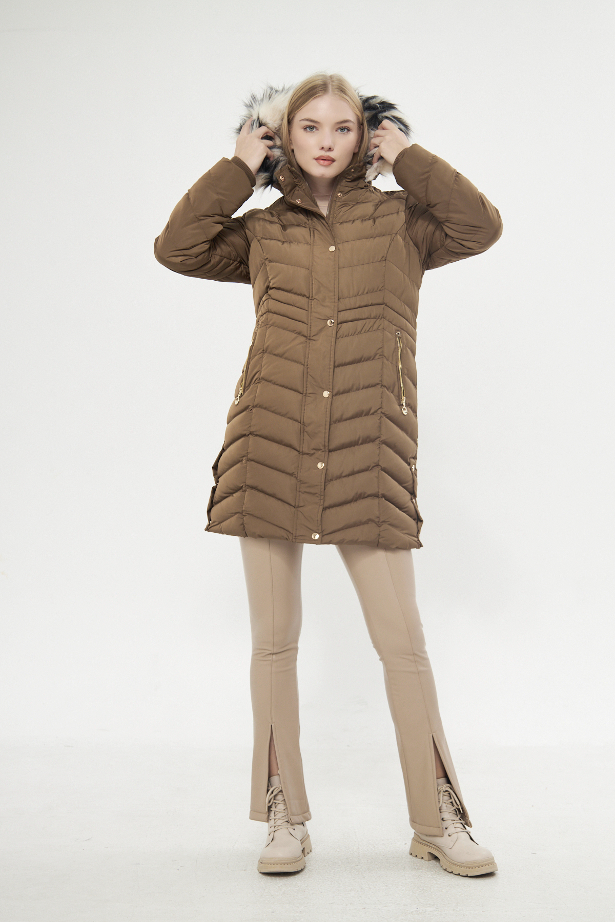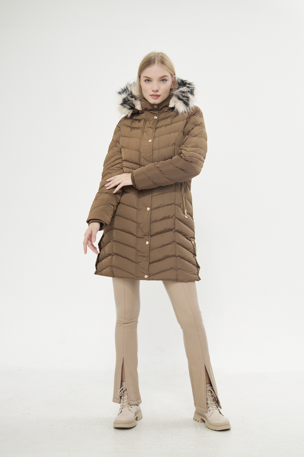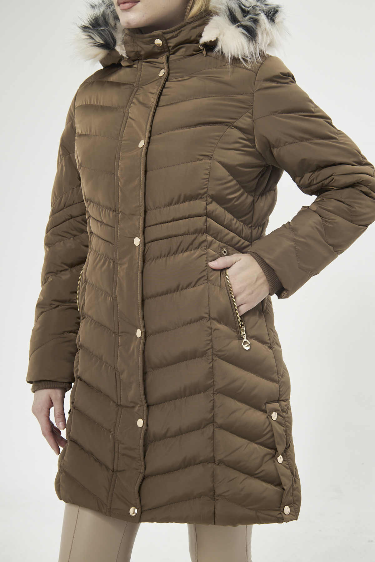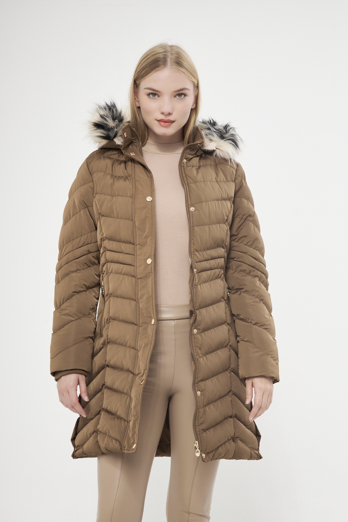 خرید اینترنتی پالتو زنانه ضخیم قهوهای روشن با کلاه جداشونده و آستر خزدار ۵۳۰۲ برند دینامو Dynamo اورجینال از DYNAMO نمایندگی ترکیه
