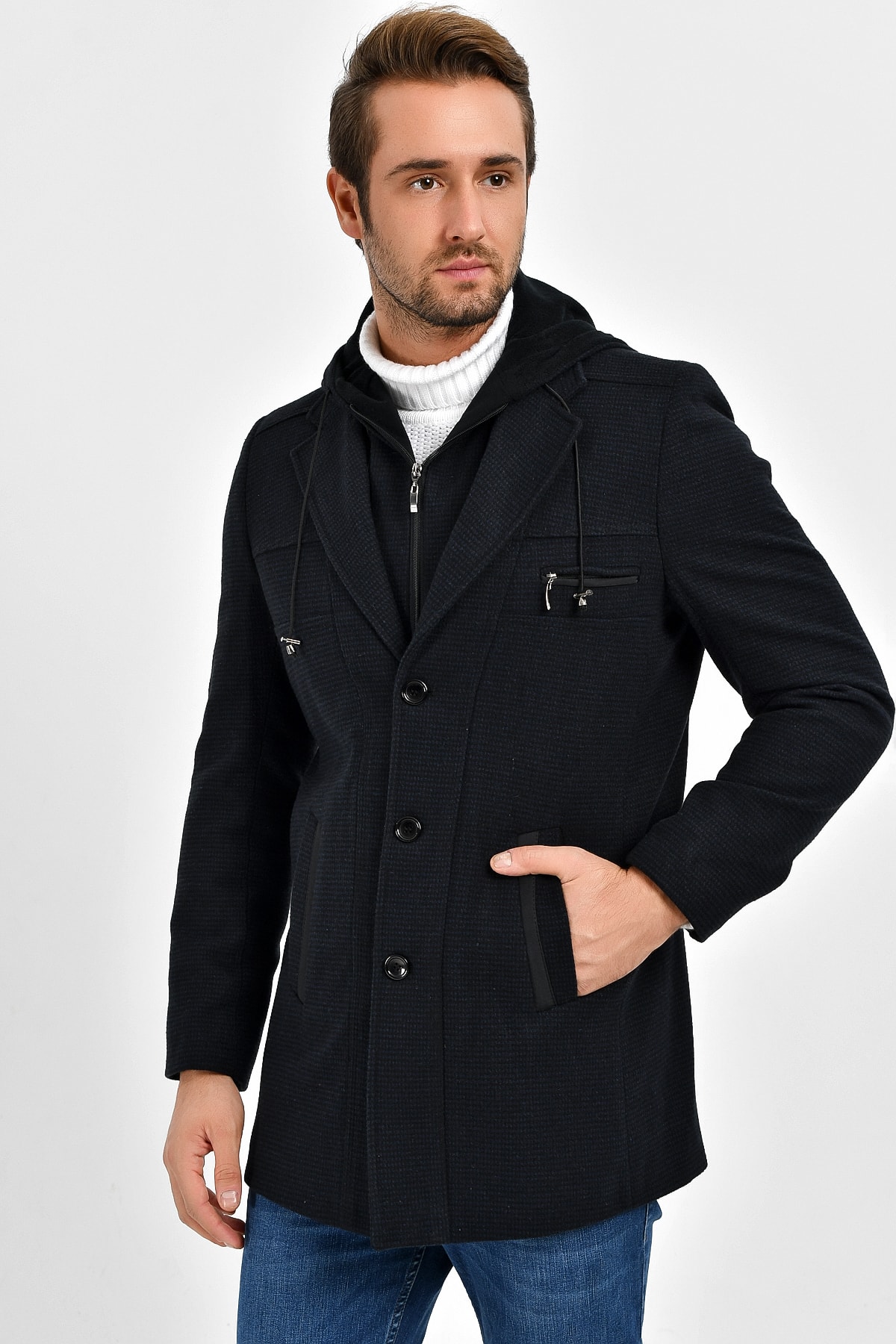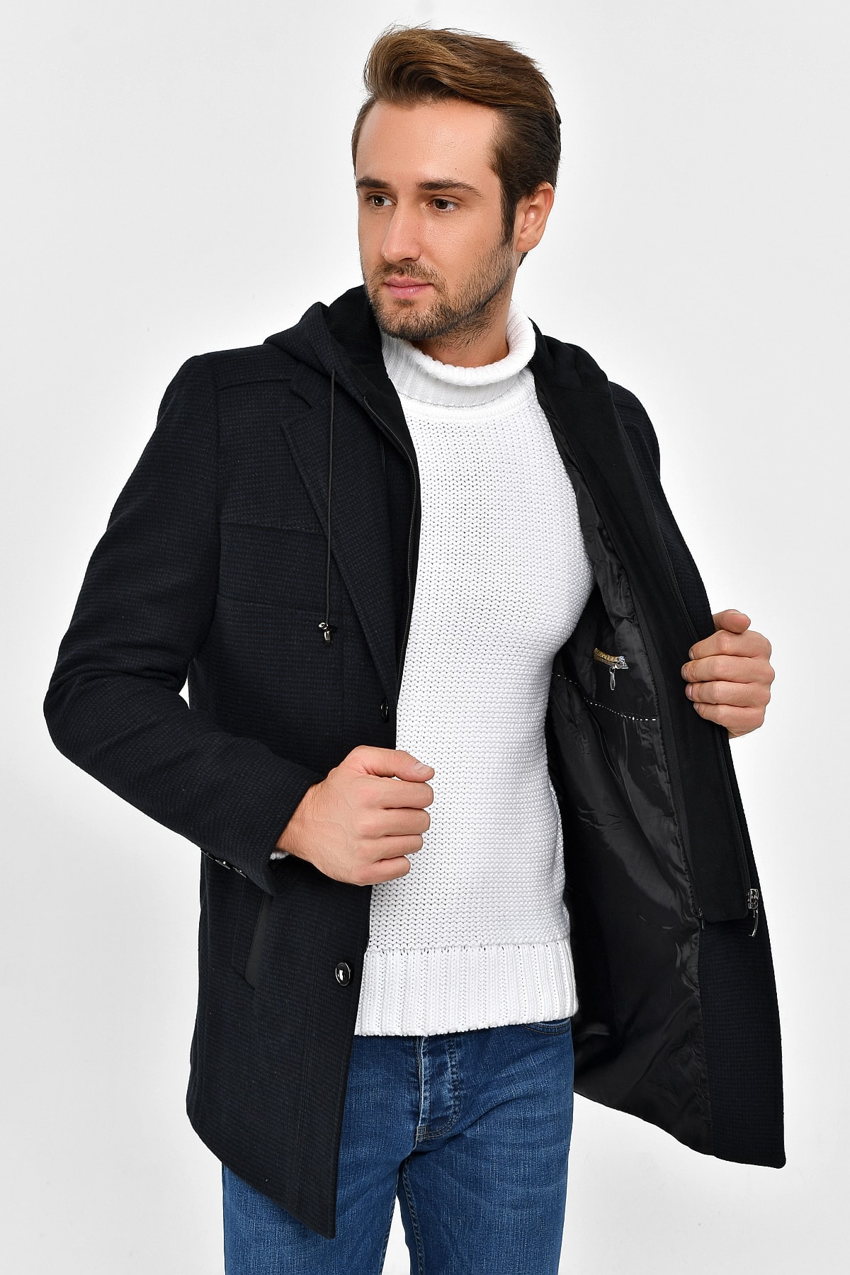 یک کت کشمیری شیک از جنس پشم ترکیبی با کلاه قابل جدا شدن و زیپ.