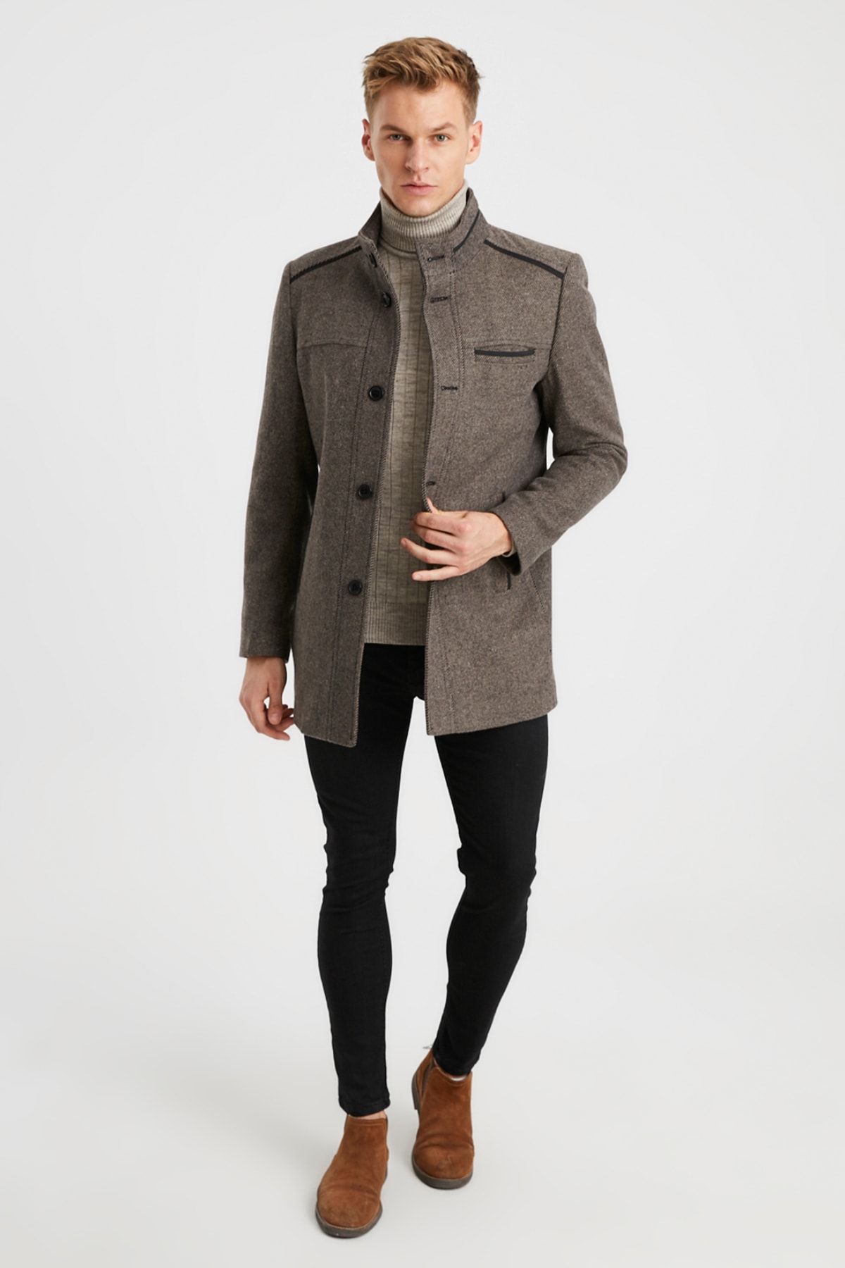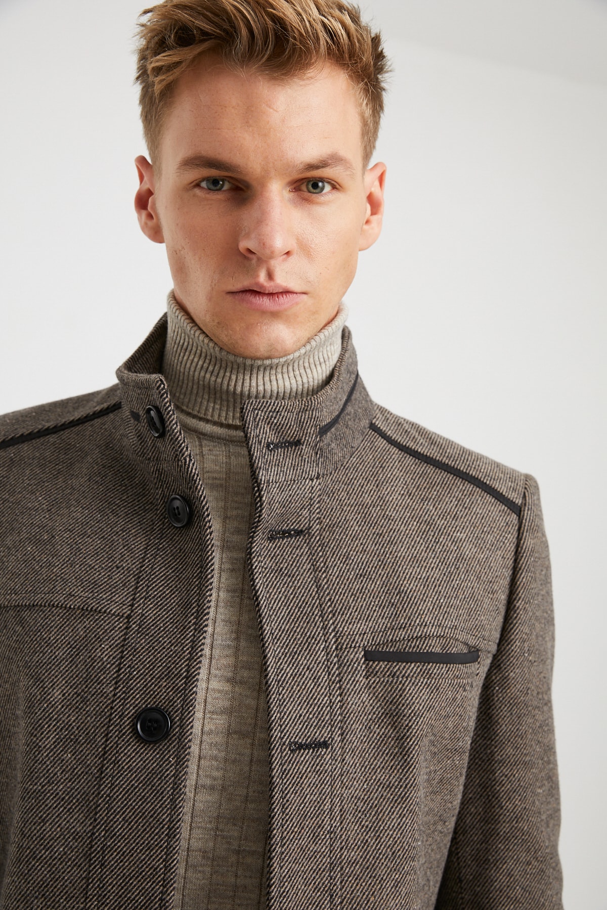 یک کت کشمیری شیک و یقه ایستاده، ترکیبی از پشم و آستر.