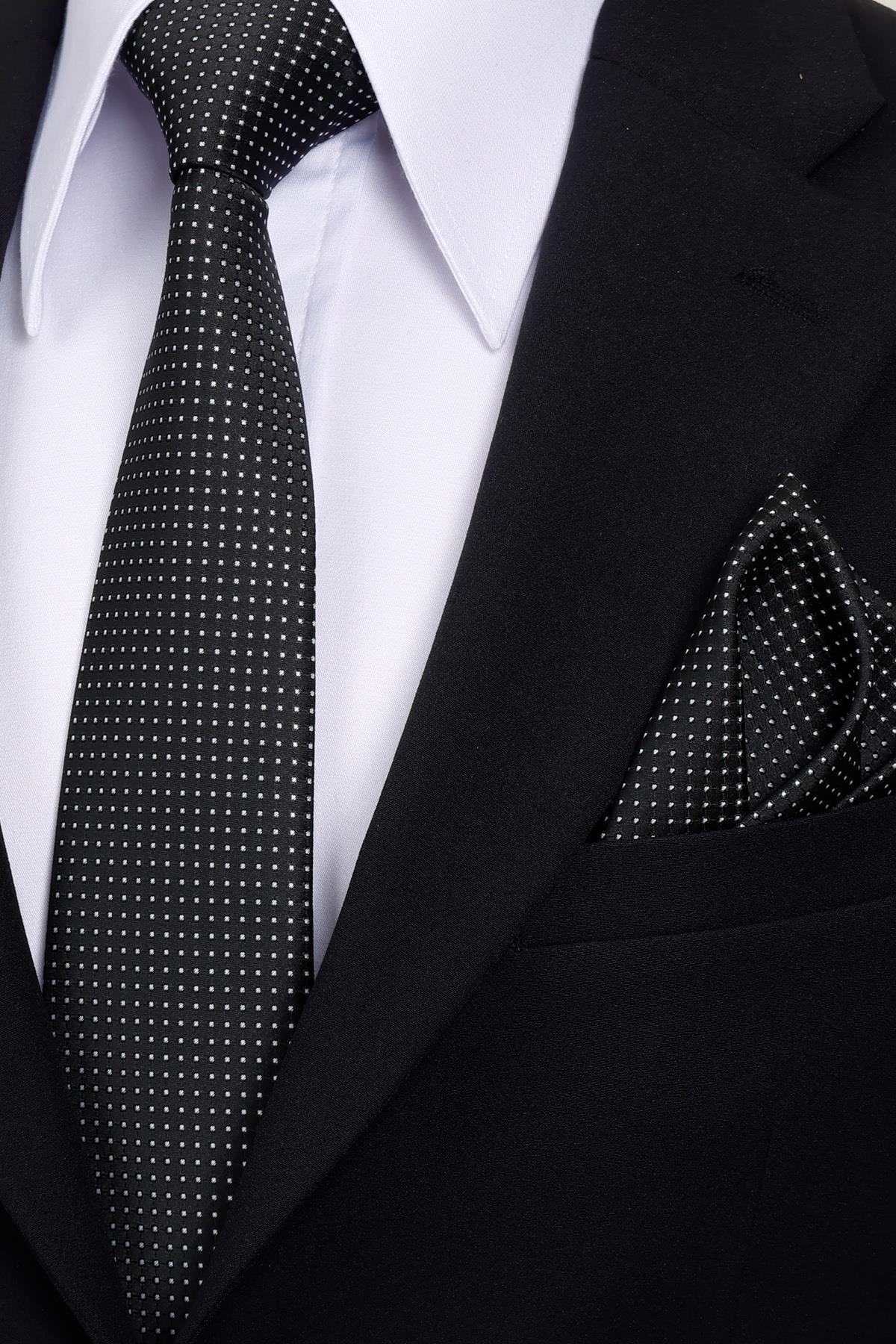 کراوات خالدار مشکی و سفید دستباف کلاسیک پهن ۸ سانتیمتری با دستمال جیبی مردانه طرح دار | Esgue ESG115KRM1185