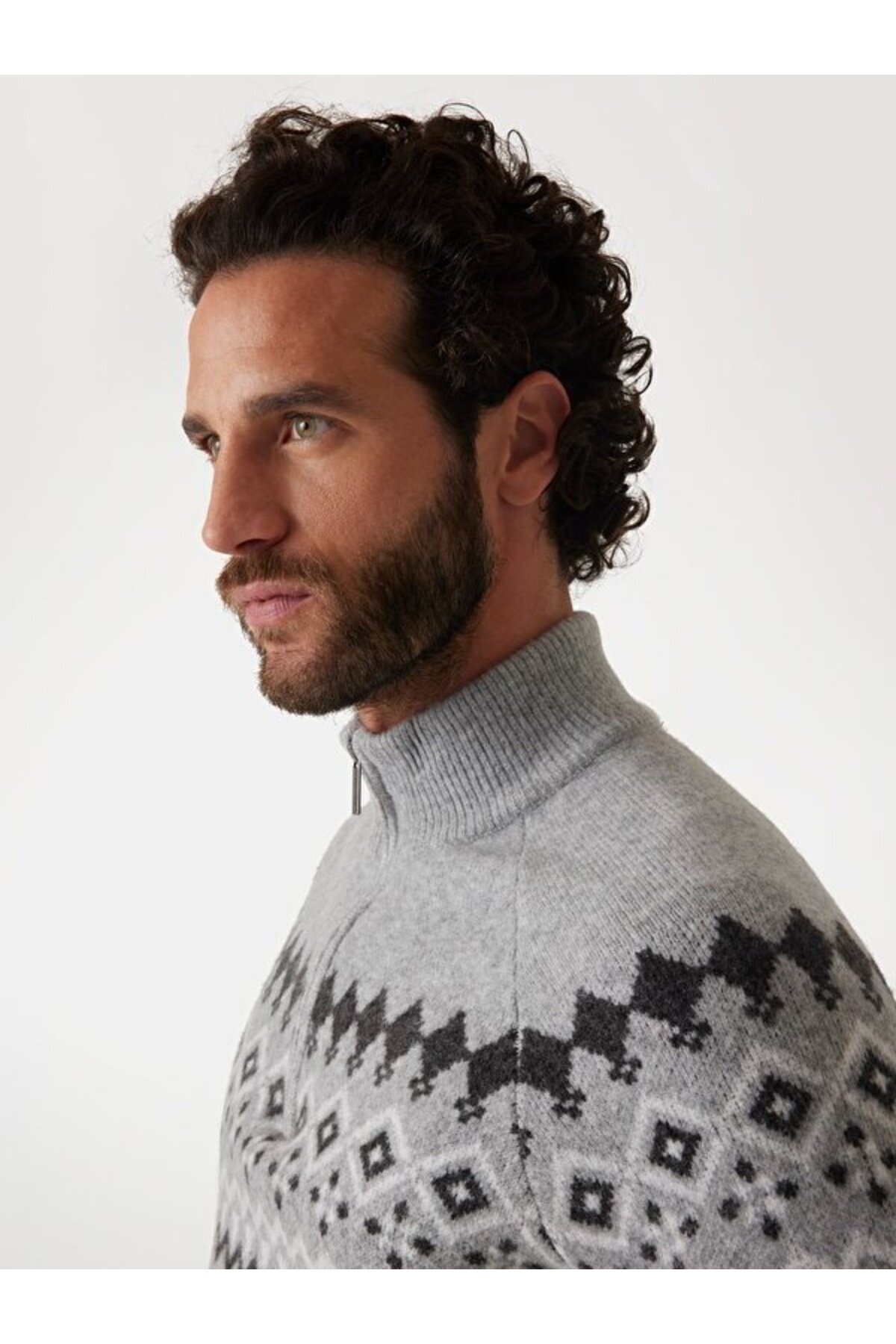 مدل ژاکت پشمی کشدار بژ، خاکستری و آبی قد 188 سانتی متری دارد. بیرونی (پارچه اصلی): 52% پلی آمید، 35% اکریلیک، 10% پشم، 3% الاستین.