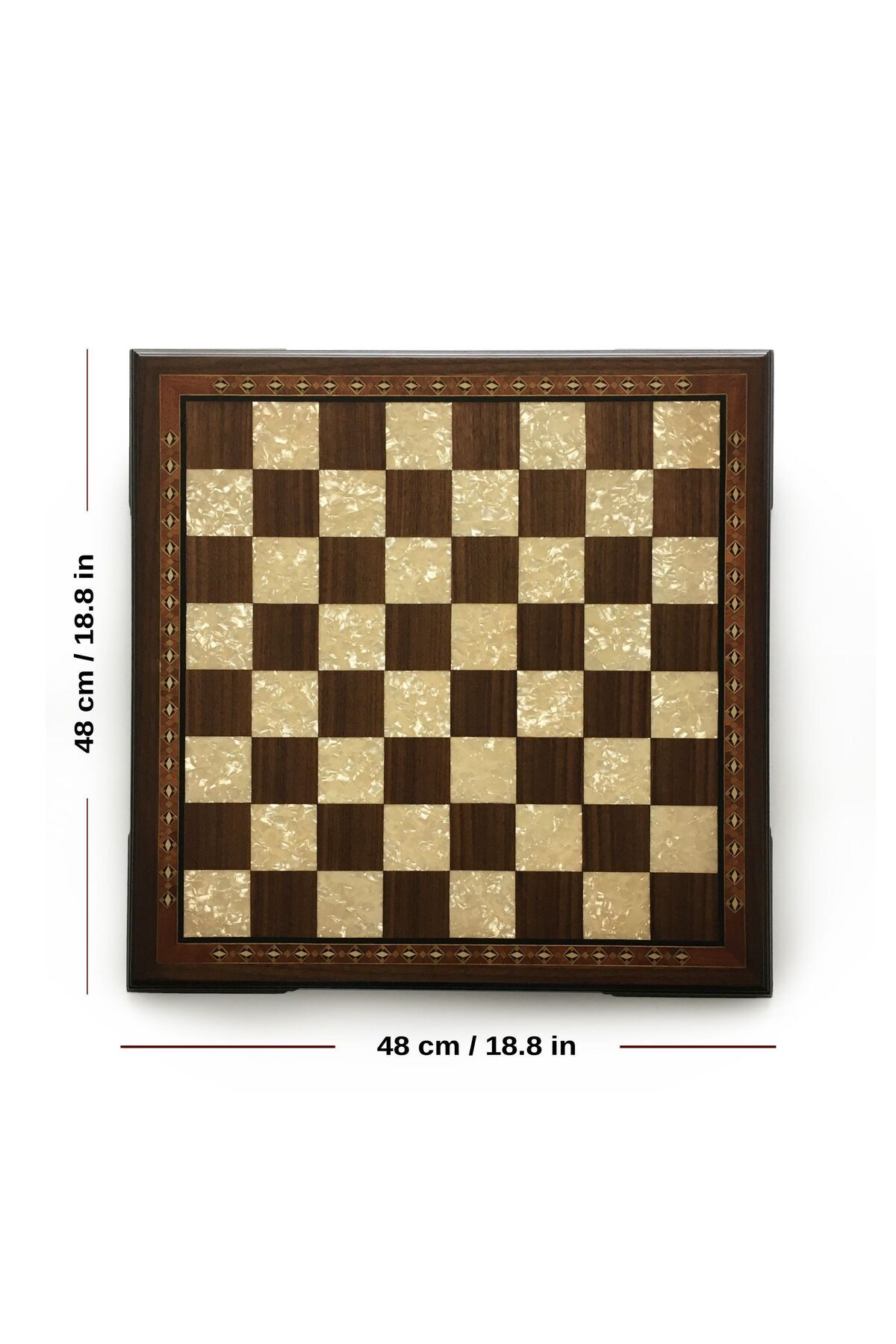 مدل: ۲۶۱۸. تخته شطرنج چوبی تفسیر شده WALE، ۴۸x۴۸ سانتیمتر / ۱۸.۸x۱۸.۸ اینچ، قاب چوبی از جنس چوب گردوی محکم، موزاییک چوبی، گلدوزی شده با چوب گردوی طبیعی، رنگهای کیسهای پارچهای، مربع، ابعاد: ۴.۹ سانتیمتر / ۱.۹ اینچ، ابعاد محصول: ۴۸ سانتیمتر در ۴۸ سانتیمتر در ۳ سانتیمتر / ۱۸.۸ اینچ در ۱۸.۸ اینچ در ۱.۱۸ اینچ، از آنجایی که در تولید آن از رنگ طبیعی و لاک سلولزی استفاده میشود، ممکن است تفاوتهای جزئی در رنگها وجود داشته باشد. از آنجایی که این محصول دستساز است، ممکن است تفاوتهای جزئی در اندازه و طرحها وجود داشته باشد.