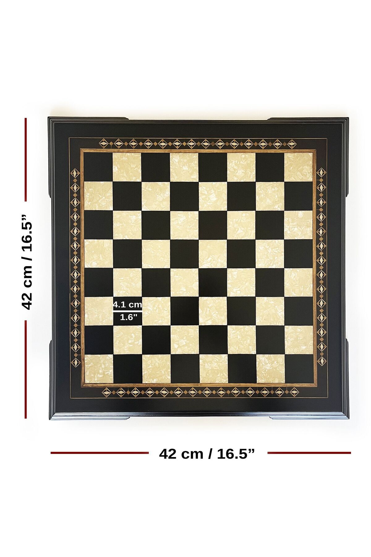 مدل: ۲۶۵۴.BLKHelena تخته شطرنج دستساز چوبی تیره، قاب چوبی یکپارچه، موزاییک چوبی، گلدوزی شده با رنگهای چوب طبیعی، کیف پارچهای، ابعاد مربع: ۴.۱ سانتیمتر / ۱.۶ اینچ. ابعاد محصول: ۴۲ سانتیمتر در ۴۲ سانتیمتر در ۳ سانتیمتر / ۱۶.۵ اینچ در ۱۶.۵ اینچ در ۱.۱۸ اینچ. از آنجایی که در تولید آن از رنگ طبیعی و لاک سلولزی استفاده میشود، ممکن است تفاوتهای جزئی در رنگها وجود داشته باشد. از آنجایی که این محصول دستساز است، ممکن است تفاوتهای جزئی در اندازه و طرحها وجود داشته باشد.
