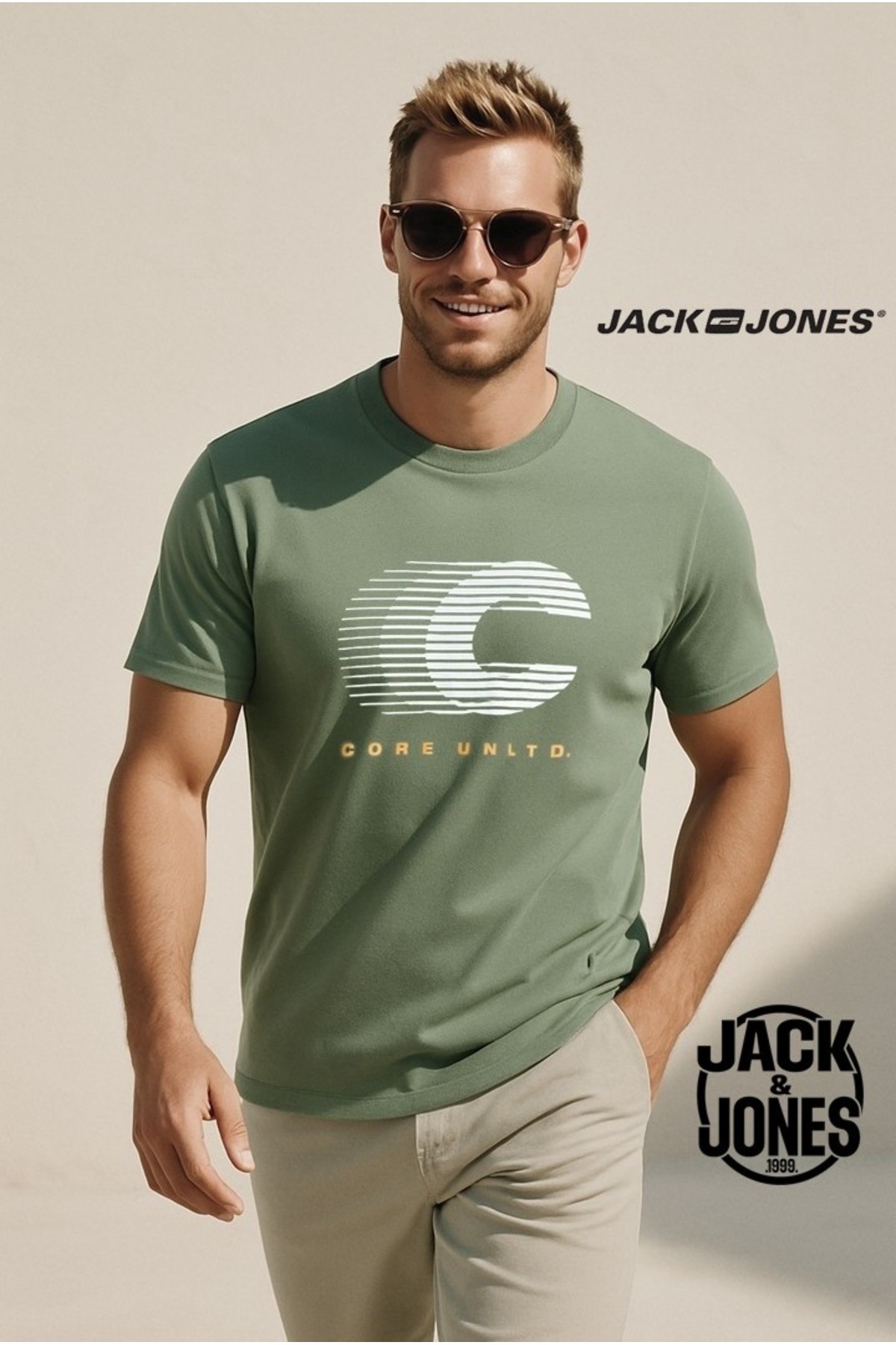خرید اینترنتی تی شرت سبز چاپ لوگوی مردانه J&J برند جک اند جونز Jack & Jones اورجینال از Marca Spor نمایندگی ترکیه