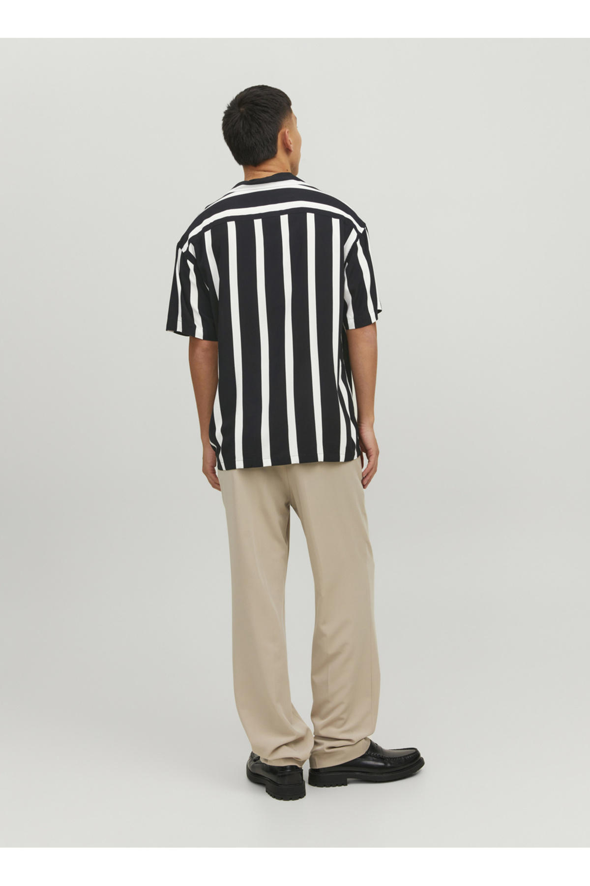 پیراهن جک اند جونز، با طرح راه راه مشکی چشمگیرش، به عنوان یک عنصر اصلی در لباسهای خیابانی خودنمایی میکند.