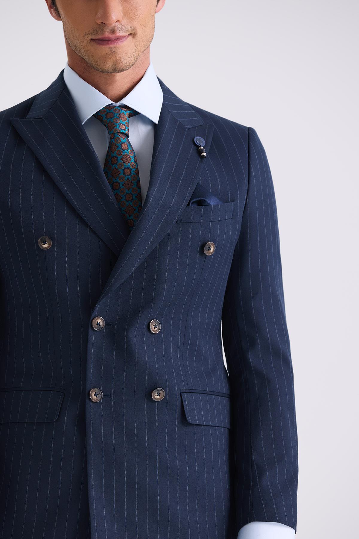خرید اینترنتی کت و شلوار دو سینه راه راه یقه نوک تیز باریک آبی نای برند جاکامن Jakamen اورجینال از Jakamen نمایندگی ترکیه