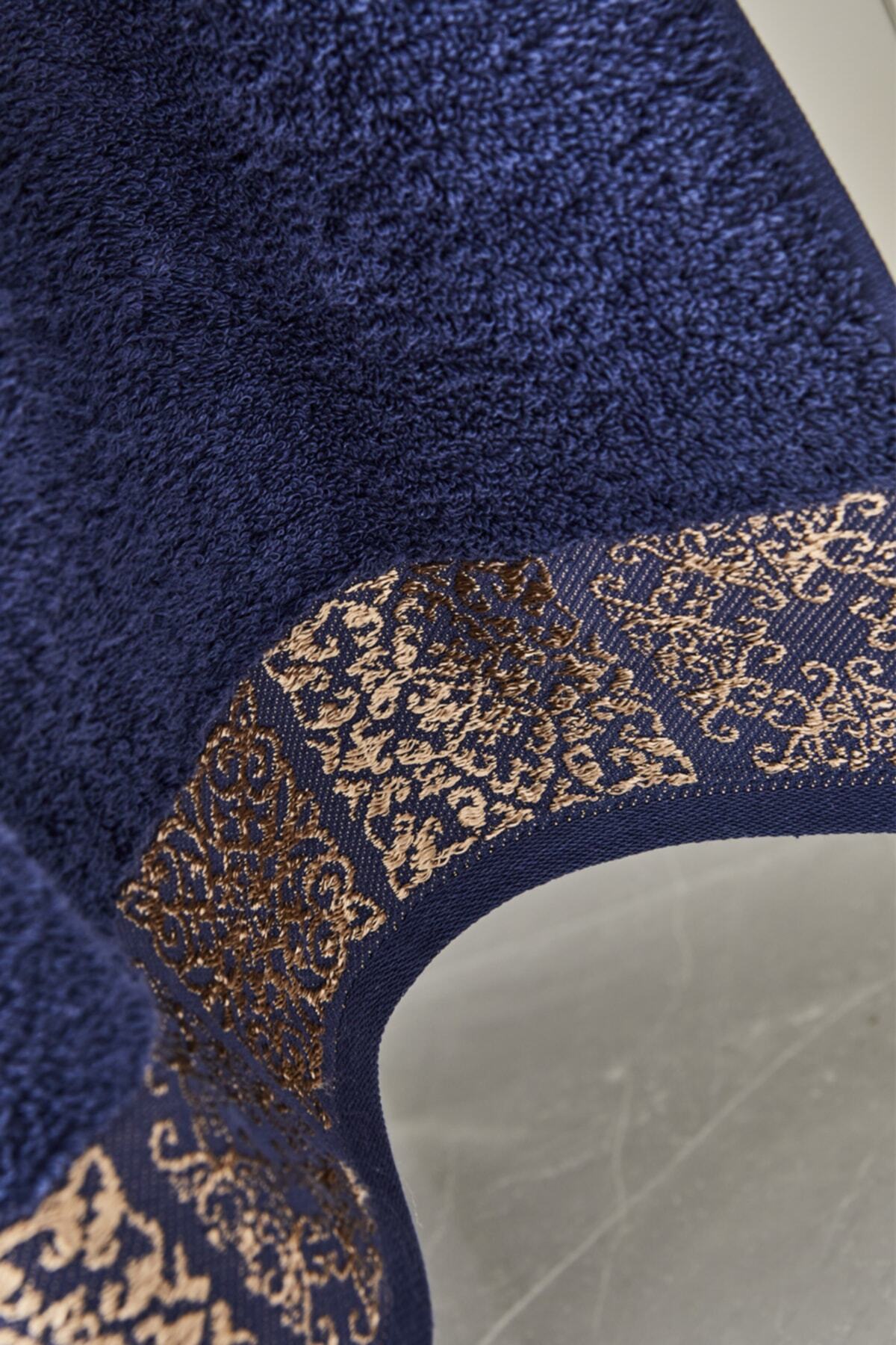 سرویس حمام خانوادگی ژاکارد ۱۰۰٪ پنبه‌ای سالواتوره آبی نفتی آف‌وایت کاراجا هوم شامل حوله ژاکارد سایز کوچک/بزرگ
