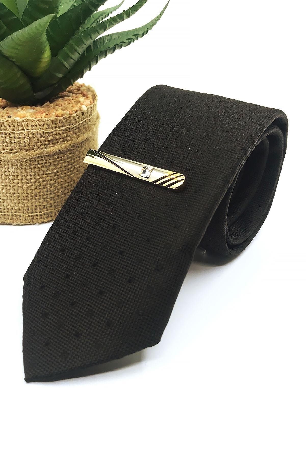 سنجاق کراوات طرح راه راه طلایی با سنگ های سفید Kıy563 مردانه | Kravatkolik KRVT8690002230622