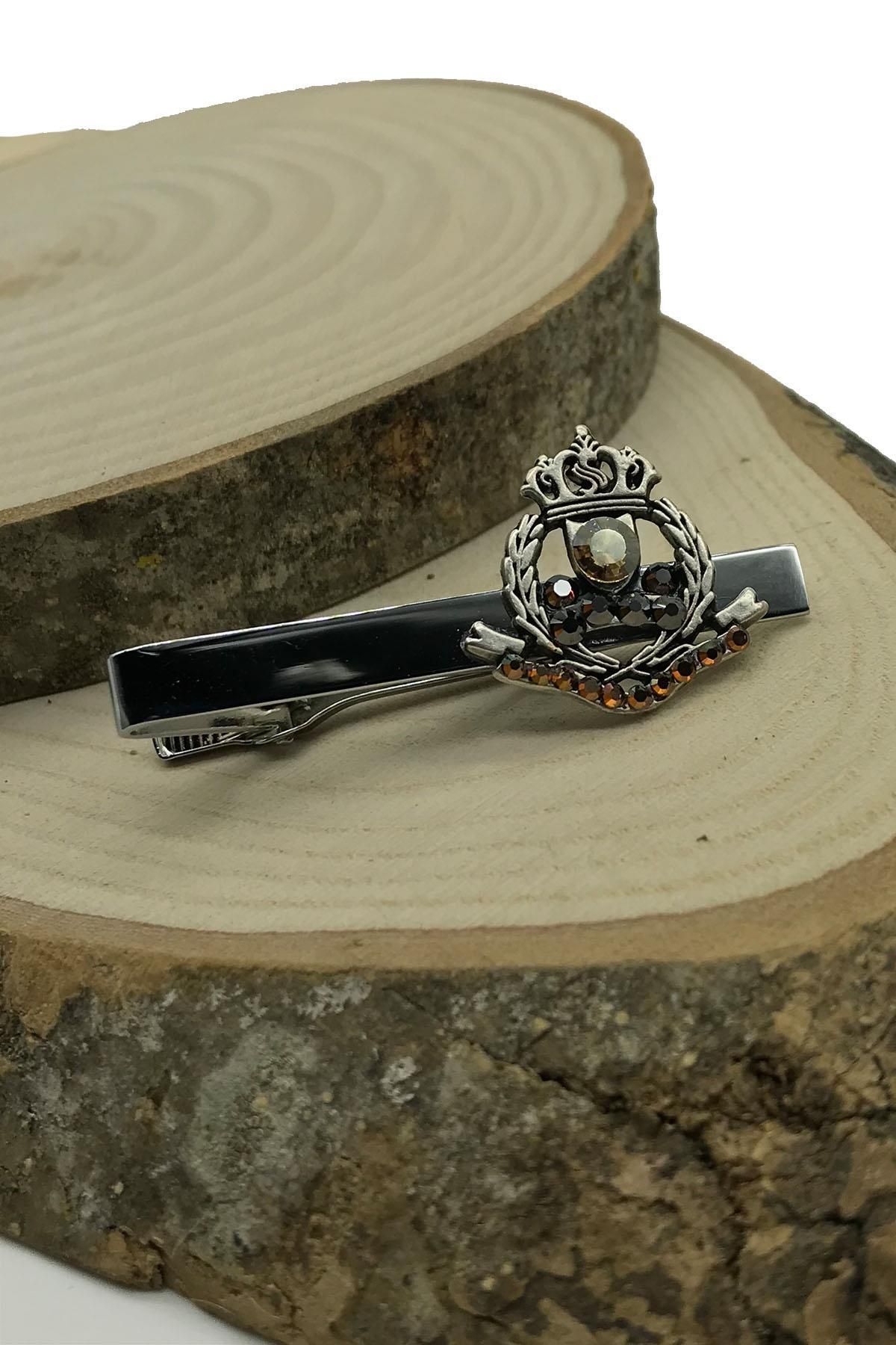 سنجاق کراوات طرح تاج شاه با سنگ کنیاک-عسلی نقرهای رنگ Kıy596 مردانه راسته | Kravatkolik KRVT8690002230658