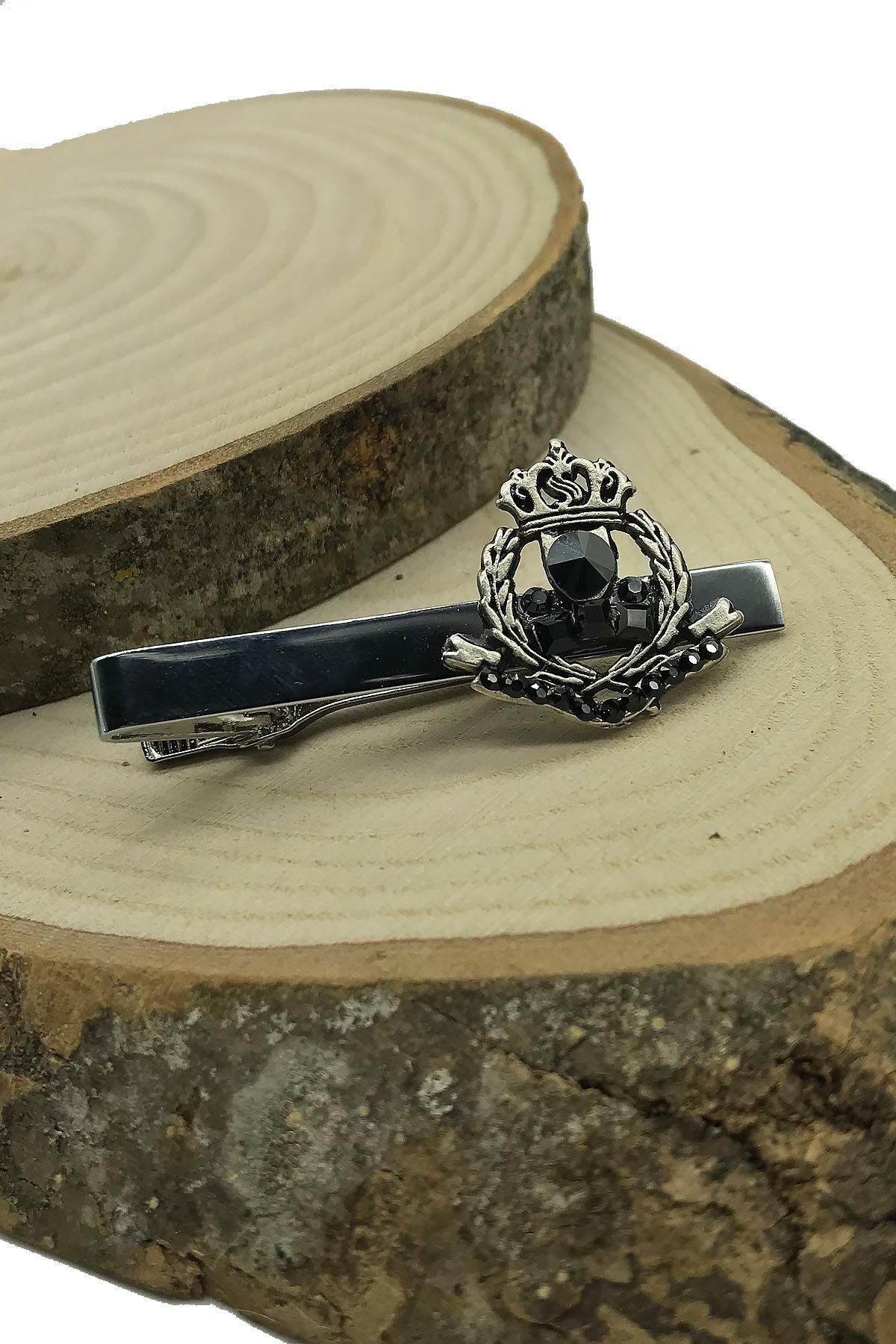 سنجاق کراوات طرح تاج شاه با سنگ مشکی نقرهای رنگی Kıy597 مردانه راسته | Kravatkolik KRVT8690002230658