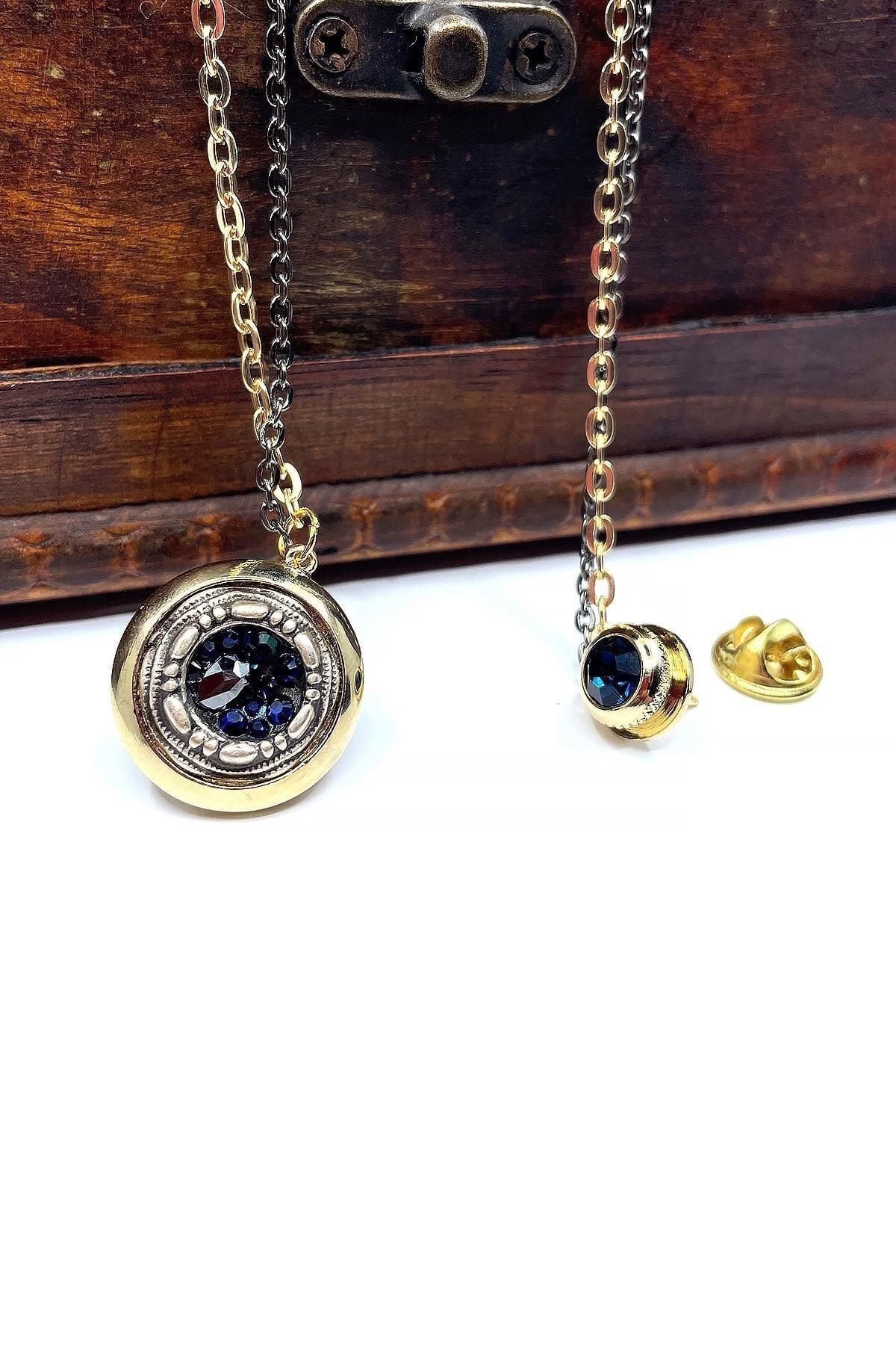 سنجاق یقه کت زنجیری سنگی سرمهای طلایی رنگ Yı364 مردانه | Kravatkolik KRVT8690002232447