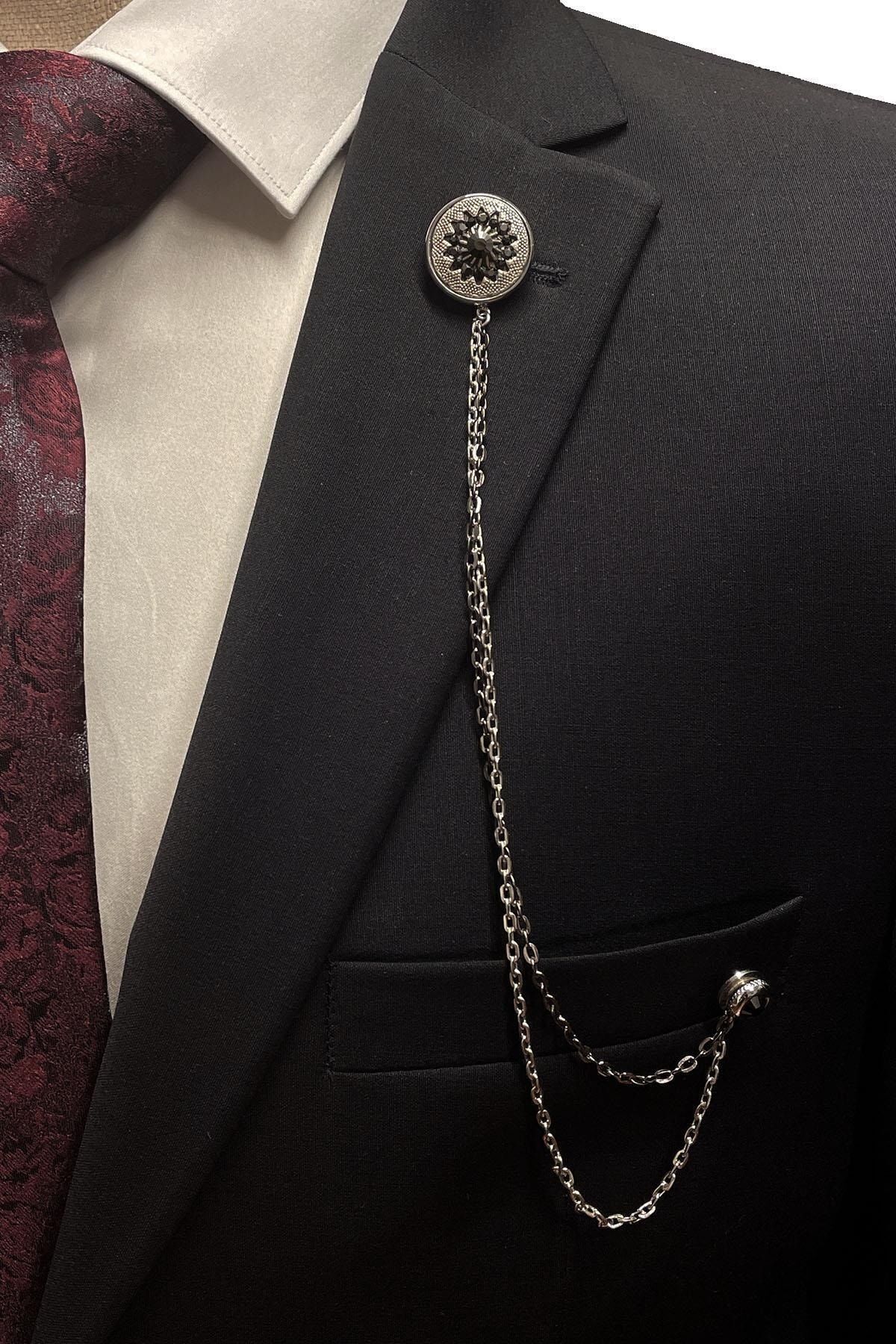 سنجاق یقه کت زنجیری نقرهای رنگ از جنس سنگ هماتیت Yı369 مردانه راسته | Kravatkolik KRVT8690002232452