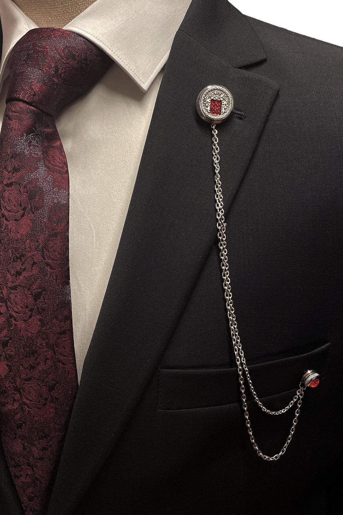 سنجاق یقه کتی نقره‌ای رنگ با سنگ قرمز Yı376 مردانه | Kravatkolik KRVT8690002232459