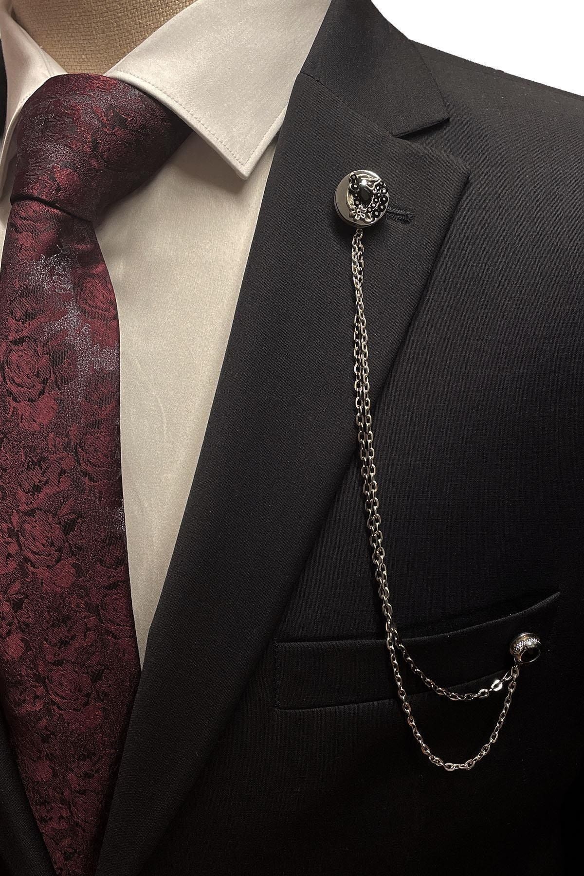 سنجاق یقه کتی نقره‌ای طرح زنجیر سنگی مشکی Yı378 مردانه راسته | Kravatkolik KRVT8690002232461