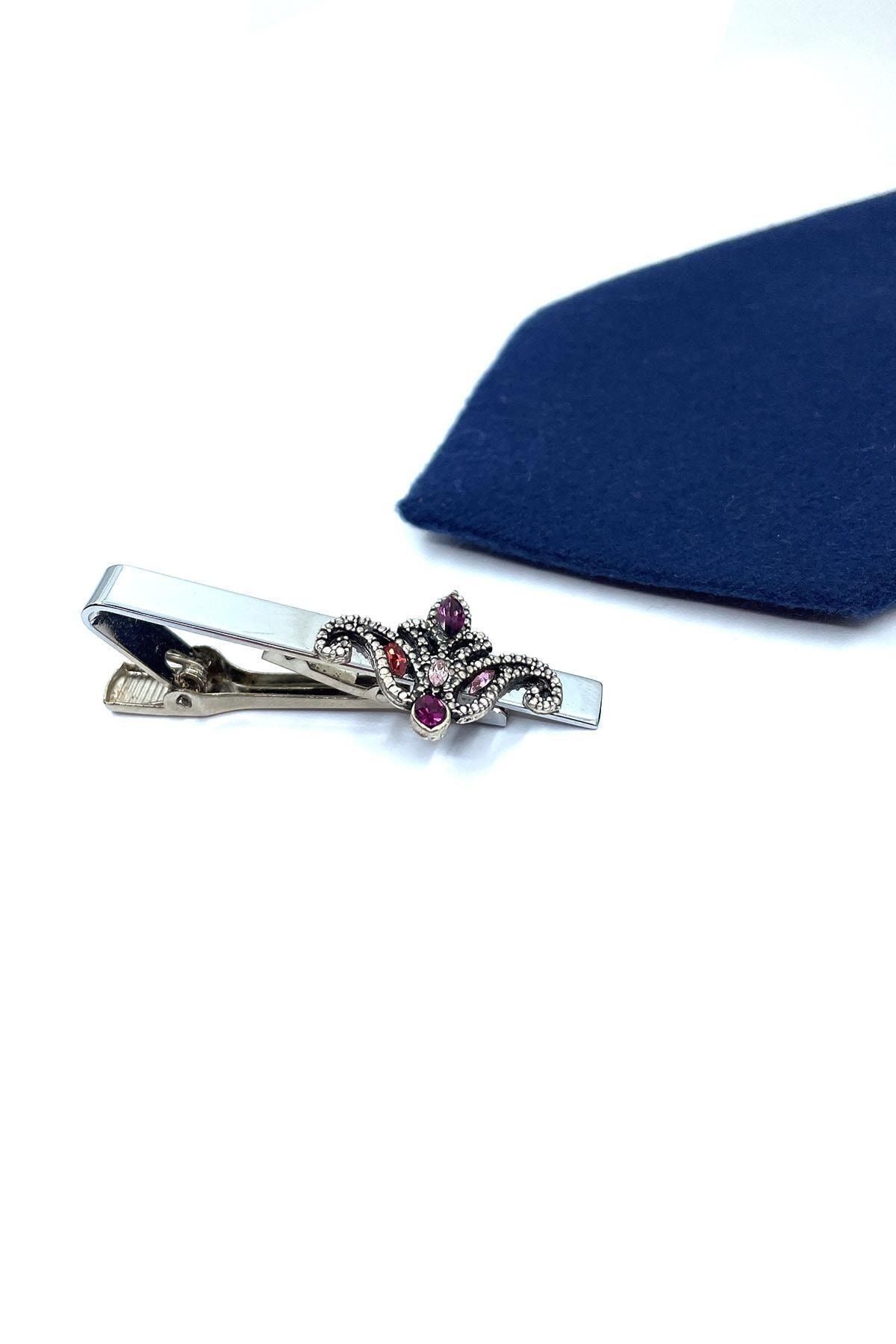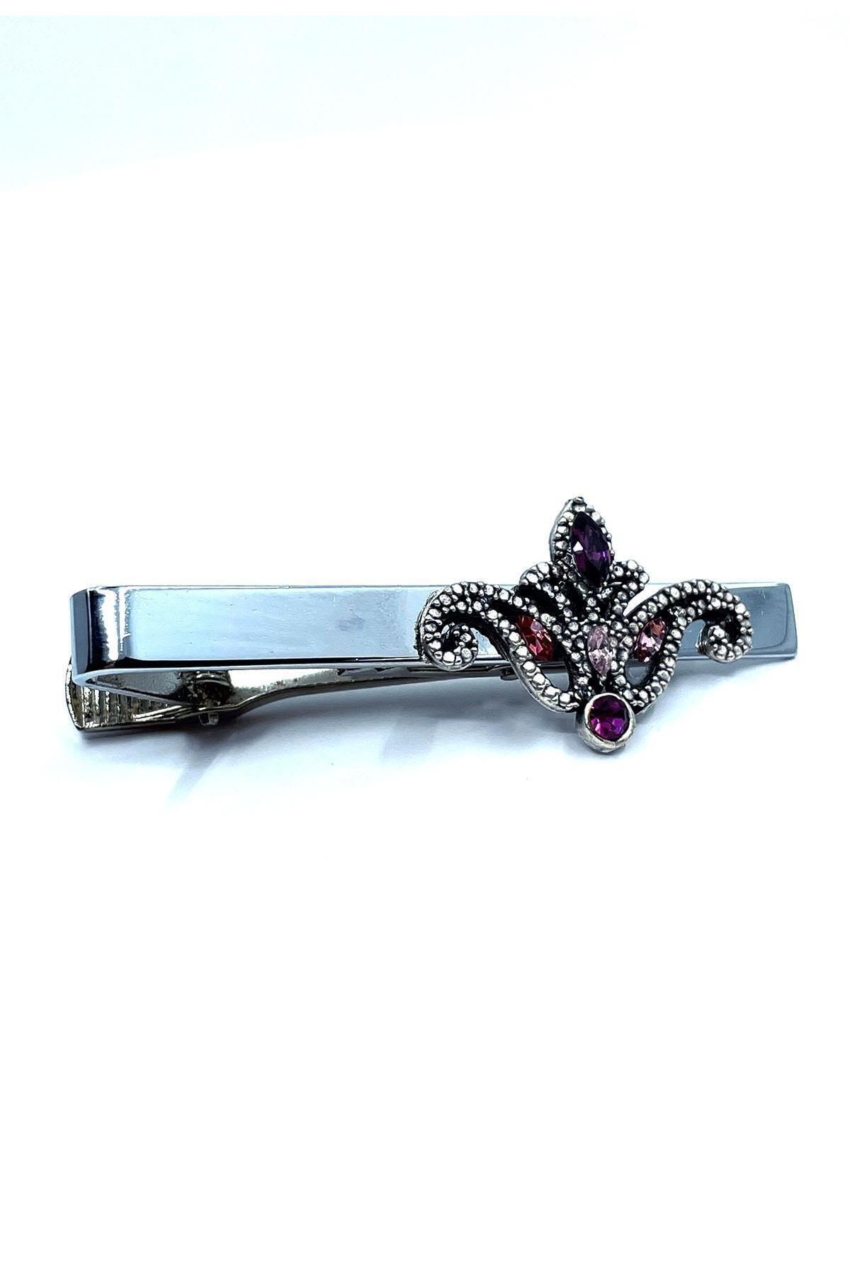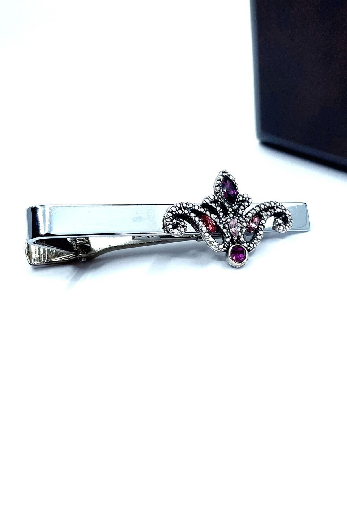 سنجاق کراوات نقره‌ای طرح لاله با سنگ بنفش Kıy699 مردانه | Kravatkolik KRVT8690002232473