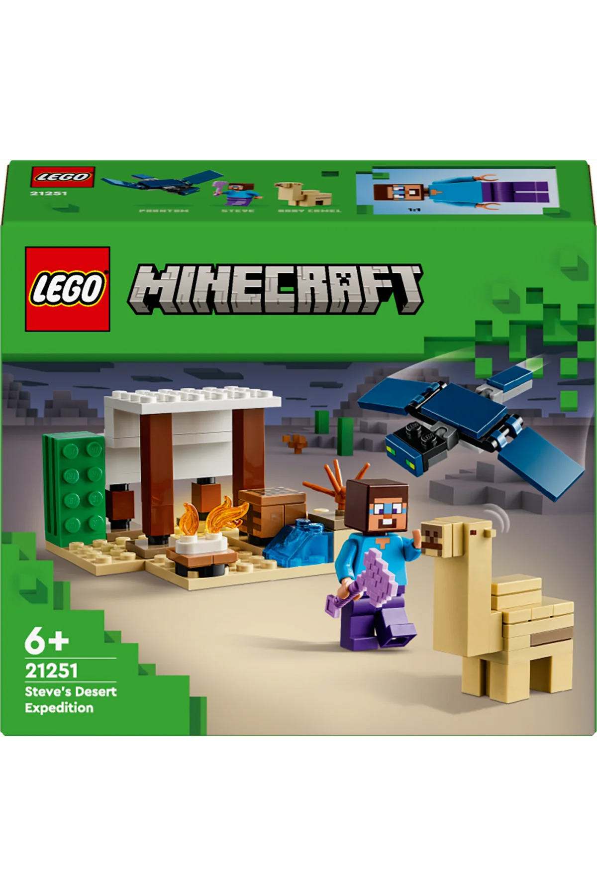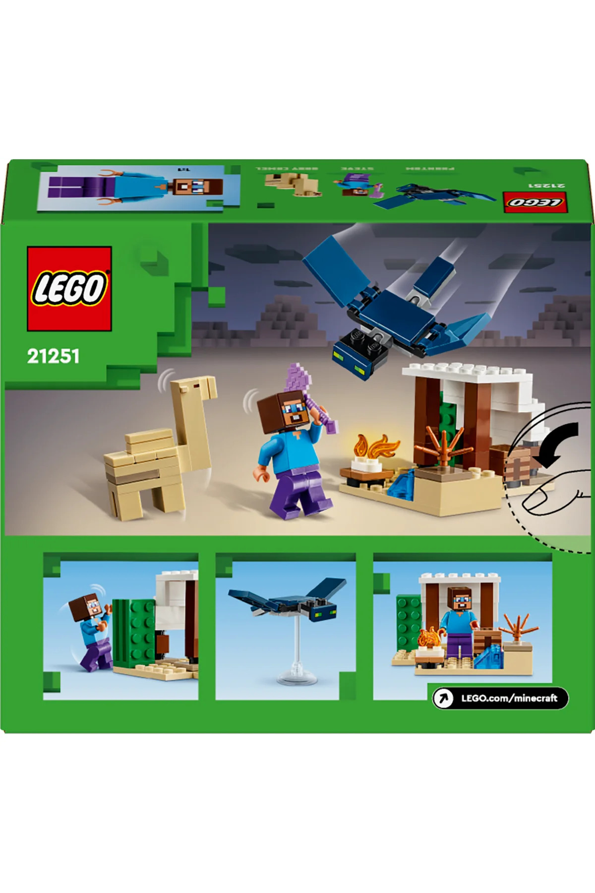 لگو ماینکرفت ۲۱۲۵۱ سفر اکتشافی استیو به صحرا (۷۵ قطعه) این اسباببازی لگو ماینکرفت برای بازیکنان ۶ سال به بالا، اولین اسباببازی ساختمانی در زیستبوم بیابانی ماینکرفت است.