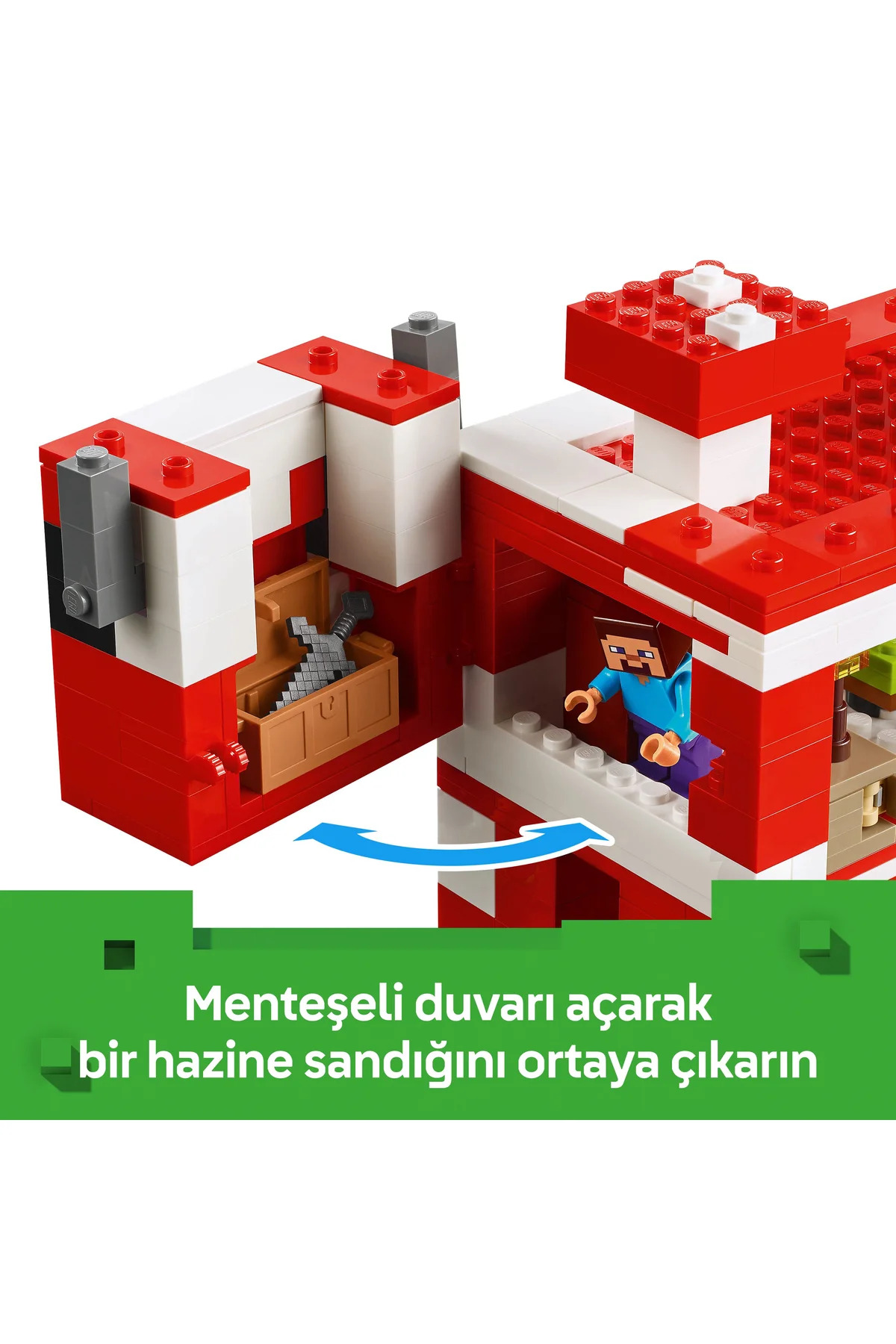 اسباب‌بازی سرگرم‌کننده لگو ماینکرفت در جزیره قارچ‌ها اتفاق می‌افتد و شخصیت محبوب استیو را به همراه یک قارچ قرمز، یک اتاقک قارچی قرمز کوچک، گربه کالیکو و فیگورهای اسباب‌بازی فانتوم پرنده دشمن به تصویر می‌کشد. این مجموعه بازی شامل عناصری است که در بازی دیده می‌شوند، از جمله یک زمین کشاورزی کوچک با گندم، قارچ و یک گیاه کوزه‌ای که در یک بشکه کود رشد می‌کند. همچنین با لوازم جانبی مانند چوب ماهیگیری، ماهی کاد، لنگر، شمشیر هلندی، کاسه، قایق پارویی، صندوقچه، اجاق گاز، میز کاردستی، قفسه کتاب، نان و تخت خواب ارائه می‌شود. این یک هدیه عالی برای کودکان است.
