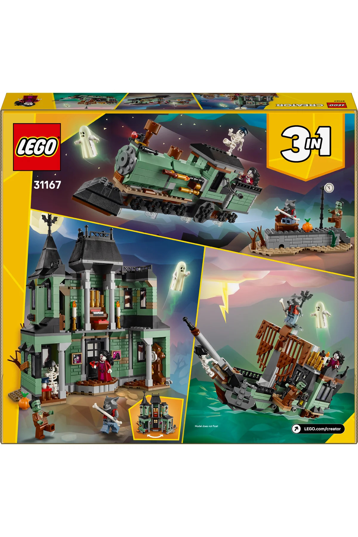 کودکان ۹ سال به بالا می‌توانند با مجموعه اسباب‌بازی‌های ساختمانی LEGO Creator 3in1 Haunted Mansion (31167) از سرگرمی‌های هیجان‌انگیز لذت ببرند. این عمارت ترسناک و قابل ساخت ۲ طبقه، مملو از جزئیات منحصر به فرد است، از جمله درهای جلو و عقب باز شونده، یک قبرستان ترسناک، یک درخت اسرارآمیز جداشدنی، یک ارگ قابل نواختن و یک چرخ و فلک که با چرخاندن آن، یک روح مرموز نمایان می‌شود. این مجموعه خلاقانه شامل ۳ مدل مختلف جن‌زده است که بچه‌ها می‌توانند از آنها برای خلق داستان‌های مختلف با استفاده از آجرهای یکسان استفاده کنند: یک عمارت جن‌زده با جزئیات دقیق، یک کشتی ارواح با جزئیات ترسناک یا یک قطار ارواح ترسناک با سکوی ریل. هر مدل با ۵ مینی‌فیگور سرگرم‌کننده ارائه می‌شود: یک گرگینه، خون‌آشام، روح شبح‌تاب، هیولای فرانکنشتاین و یک اسکلت. بچه‌ها می‌توانند با این شخصیت‌ها غرق در بازی‌های تخیلی بی‌پایان شوند و انواع داستان‌های ترسناک را خلق کنند. مجموعه‌های LEGO Creator 3in1 با مدل‌های متنوعی که بر اساس بزرگترین علایق کودکان ساخته شده‌اند، خلاقیت را در آنها برمی‌انگیزند. بچه‌ها می‌توانند این مدل‌ها را بسازند و بازسازی کنند تا ماجراجویی‌های مختلفی را آغاز کنند. این مجموعه‌ها موضوعات متنوعی از جمله ماشین‌های فوق‌العاده سریع، حیوانات جذاب و سازه‌های دقیق را ارائه می‌دهند (مجموعه‌ها جداگانه فروخته می‌شوند و نمی‌توان همزمان آنها را ساخت).
