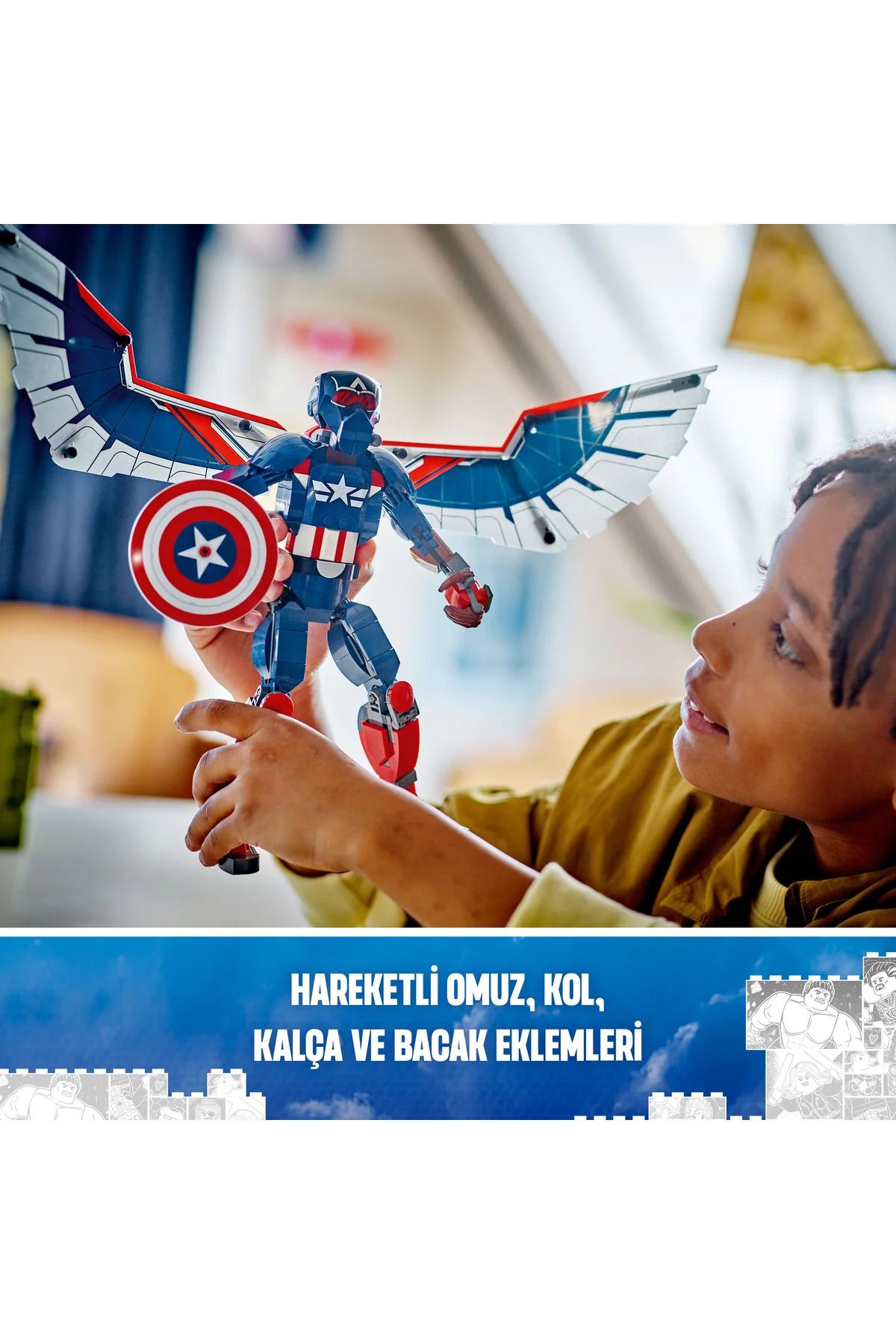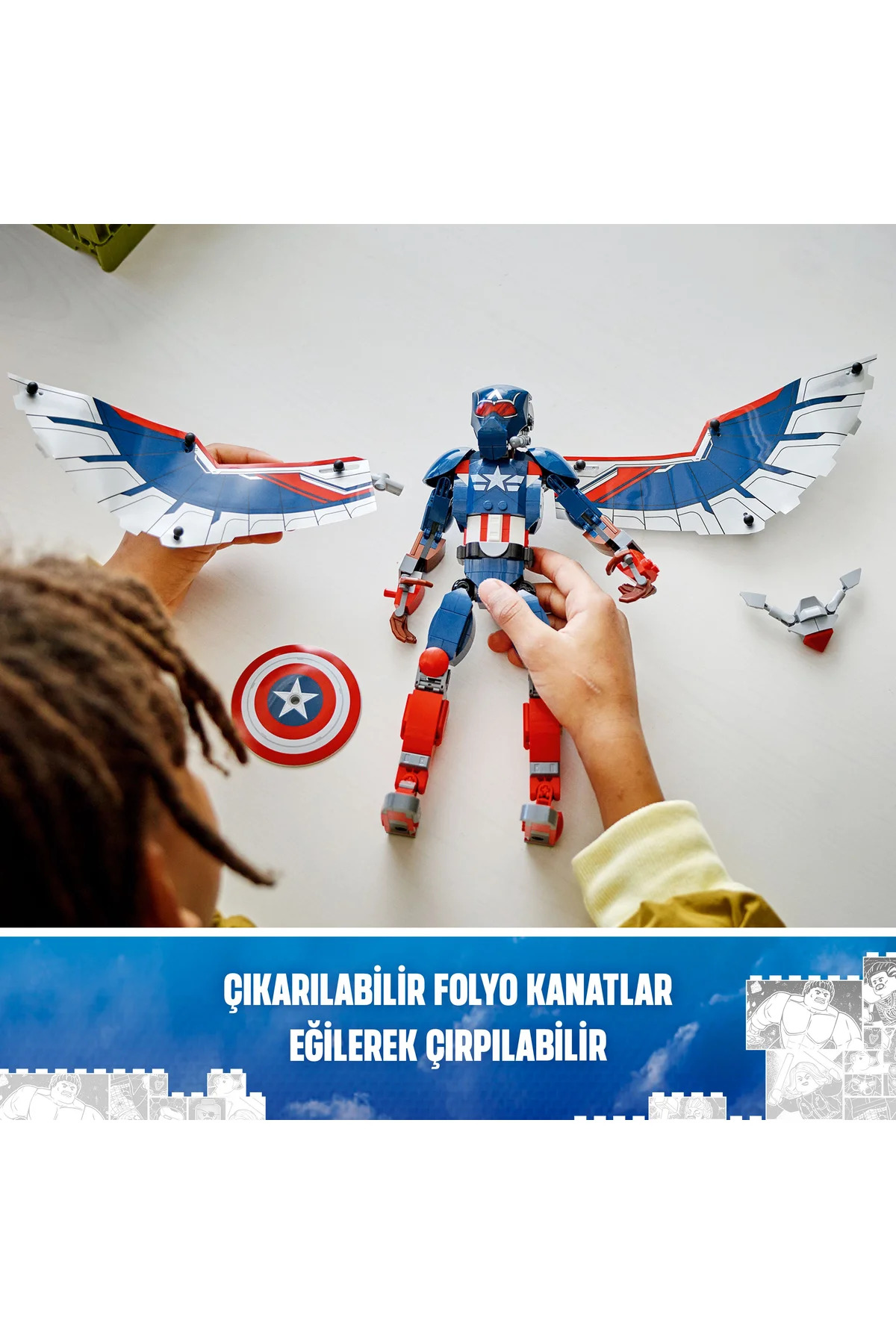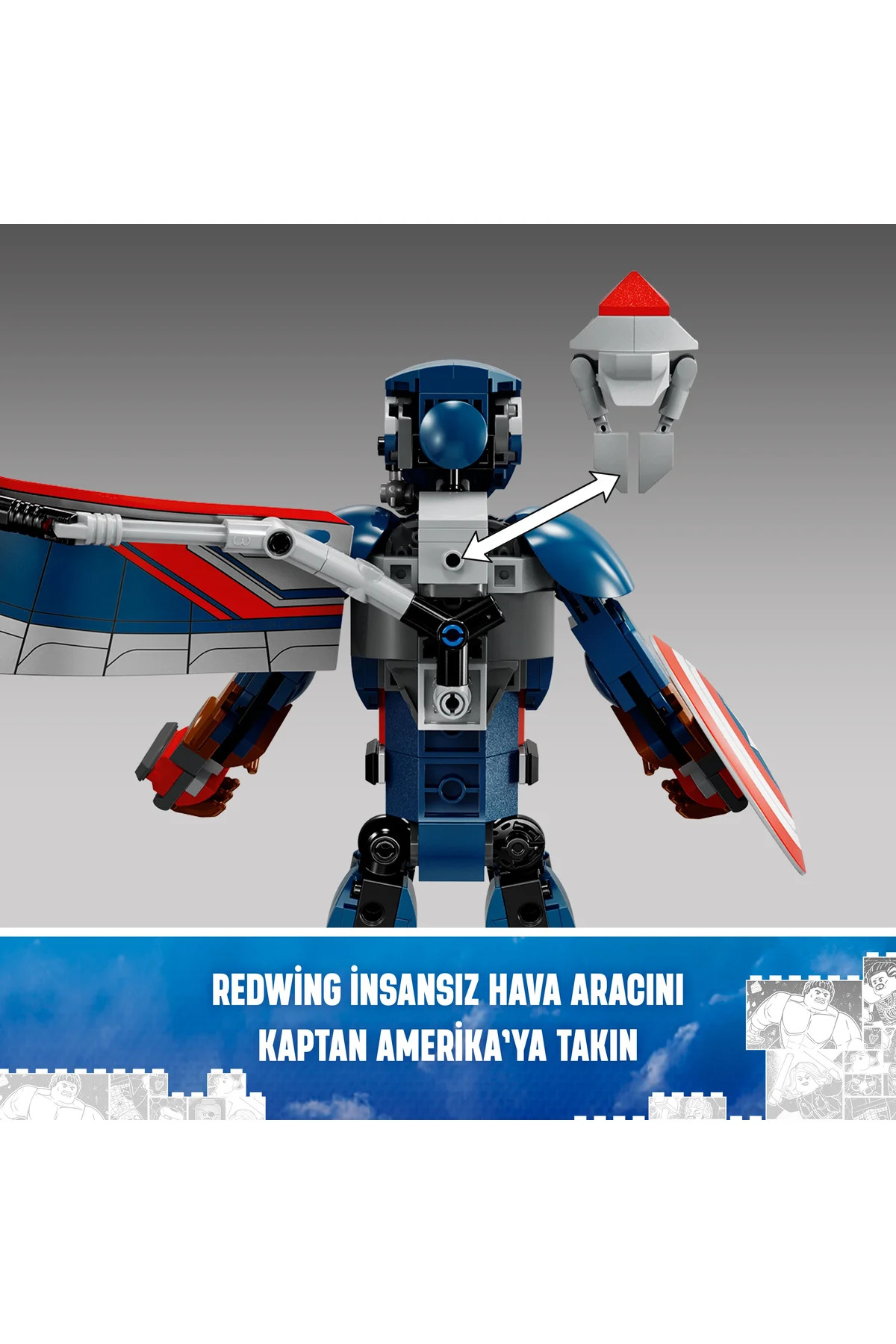 با فیگور ساختمانی کاپیتان آمریکای جدید لگو مارول (76296) با جزئیات دقیق و کاملاً مفصل، برای کودکان 8 سال به بالا، اکشن فیلمهای مارول را در دستان ابرقهرمانان جوان قرار دهید. در این نسخه از سرباز فوقالعاده مارول، فالکون بالدار نقش کاپیتان آمریکا را بر عهده میگیرد و بُعد دیگری به تجربه بازی کودکان اضافه میکند. این اسباببازی ابرقهرمانی قابل ساخت 28 سانتیمتر ارتفاع دارد و دارای مفاصل شانه، بازو، لگن و پا با قابلیت حرکت برای ژستهای اکشن واقعگرایانه است، زیرا کودکان خود را در فعالیتهای نقشآفرینی تخیلی غرق میکنند. بالهای فویلی بزرگی به پشت فیگور متصل شدهاند. بالها را میتوان خم کرد تا بال زدن را شبیهسازی کنند و هنگام فرود آمدن اکشن، به راحتی جدا میشوند. فیگور کاپیتان آمریکا سپر معروف خود را حمل میکند و اسباببازی پهپاد قابل ساخت ردوینگ که به پشت او متصل است، به راحتی برای بازی مستقل قابل جدا شدن است. سازندگان میتوانند با بزرگنمایی و چرخاندن مدلها به صورت سهبعدی و ردیابی پیشرفت خود با برنامه سرگرمکننده و شهودی LEGO Builder، از سرگرمی دیجیتالی بیشتری لذت ببرند.
