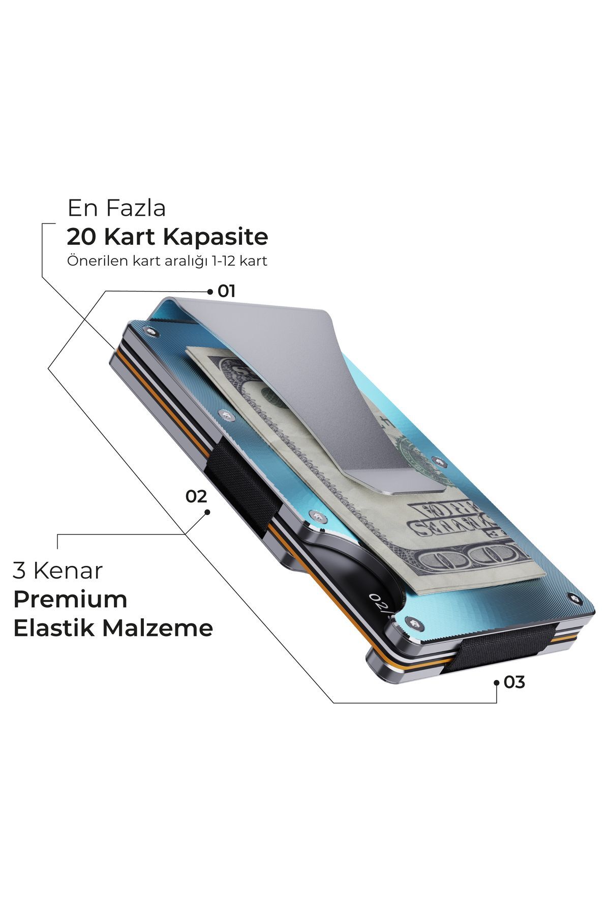 کیف پول فلزی دارای نوارهای الاستیک در سه طرف است تا کارتها را محکم کند و از لغزش آنها جلوگیری کند.