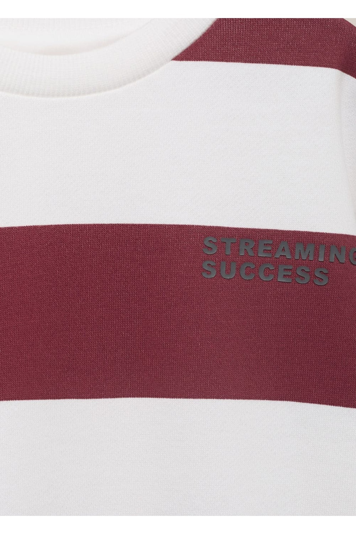 پارچه ۱۰۰٪ پنبه، پارچه راه راه، طرح ساده، یقه گرد بدون کلاه، آستین بلند، یقه، سرآستین و لبه چیندار، متن چاپی در جلو.