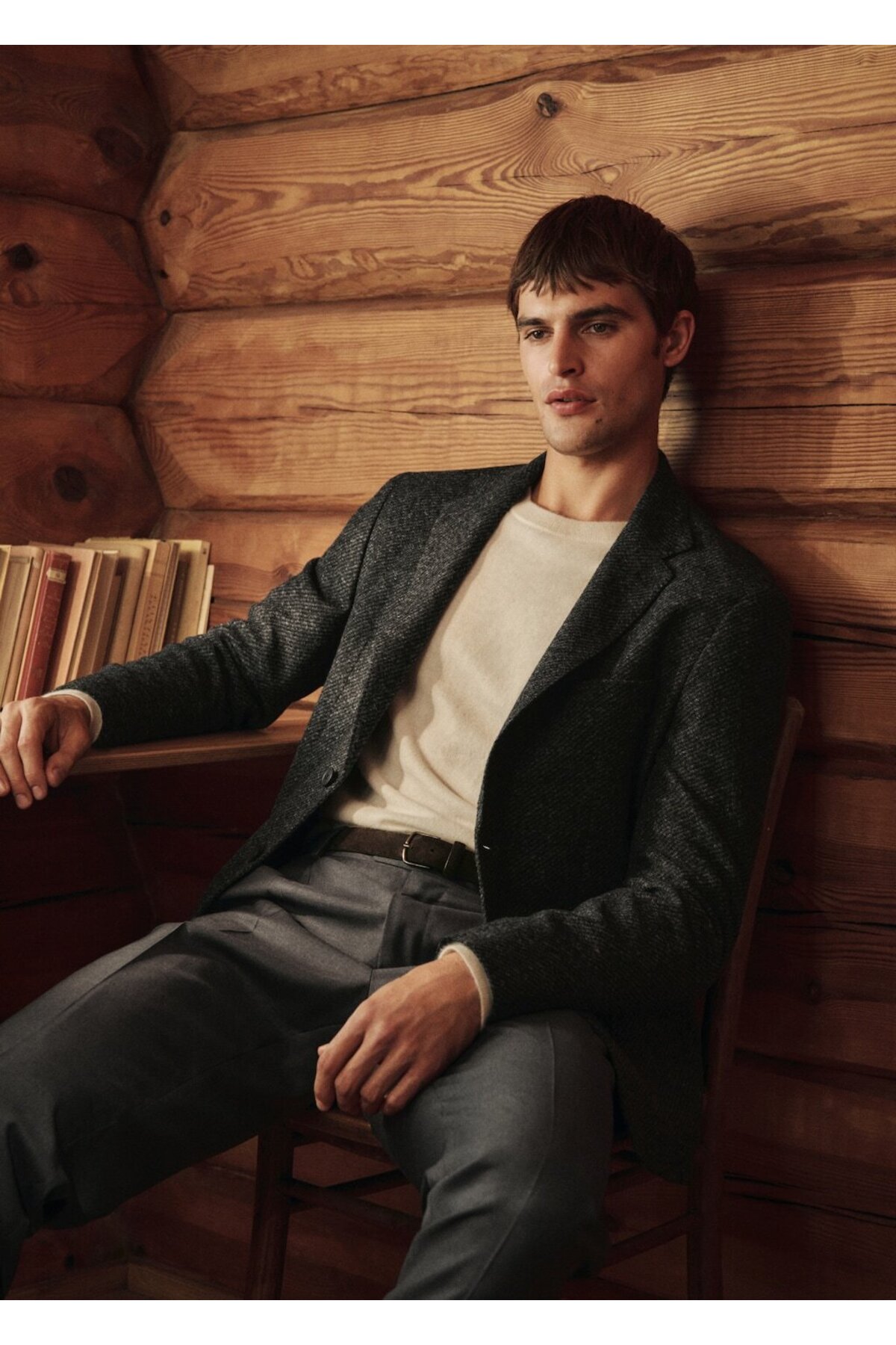 تن‌خور باریک، جنس پشم ایتالیایی، یقه برگردان، دوخت دو دکمه، جیب کش‌دار روی سینه، دو جیب وصله‌ای در جلو، آستین بلند با سرآستین دکمه‌دار، جیب‌های داخلی، انتخاب: مجموعه کلاسیک با خطوط مینیمالیستی و توجه به جزئیات.
