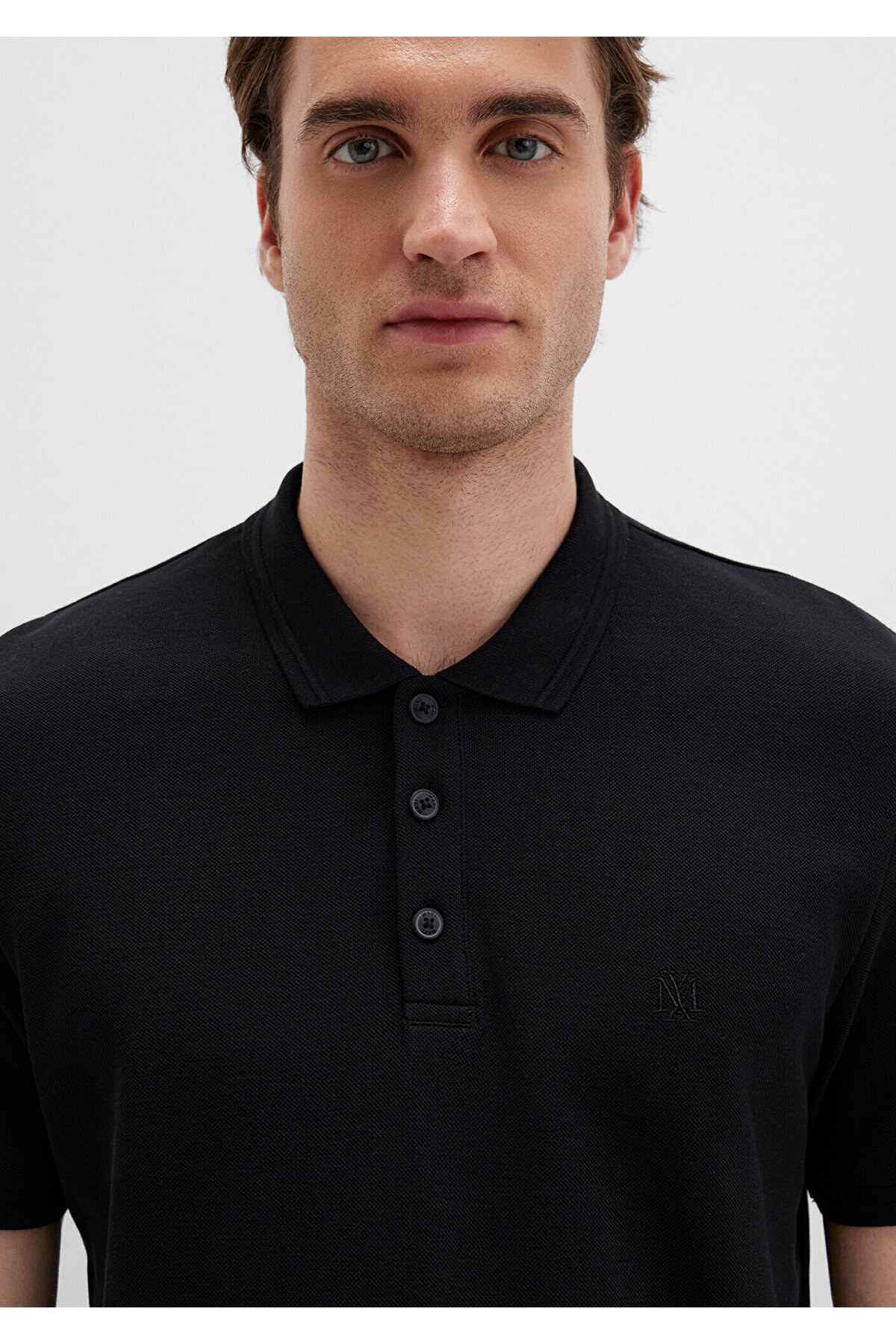 این تی شرت مشکی که با طراحی نیم دکمه و آستین کوتاه متمایز است از پارچه ای با وزن متوسط ساخته شده است.