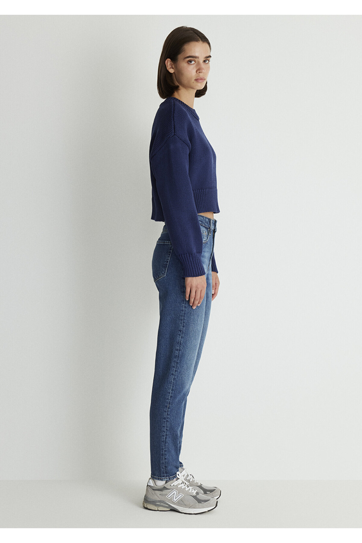ساق لاغر کمر جین مامان. ابعاد مدل: قد: 179 سانتی متر / دور کمر: 59 سانتی متر / سینه: 84 سانتی متر / باسن: 90 سانتی متر. جنس: 99% پنبه 1% الاستین. این محصول دارای 99% پنبه احیا کننده دارای گواهی REGENAGRI می باشد.
