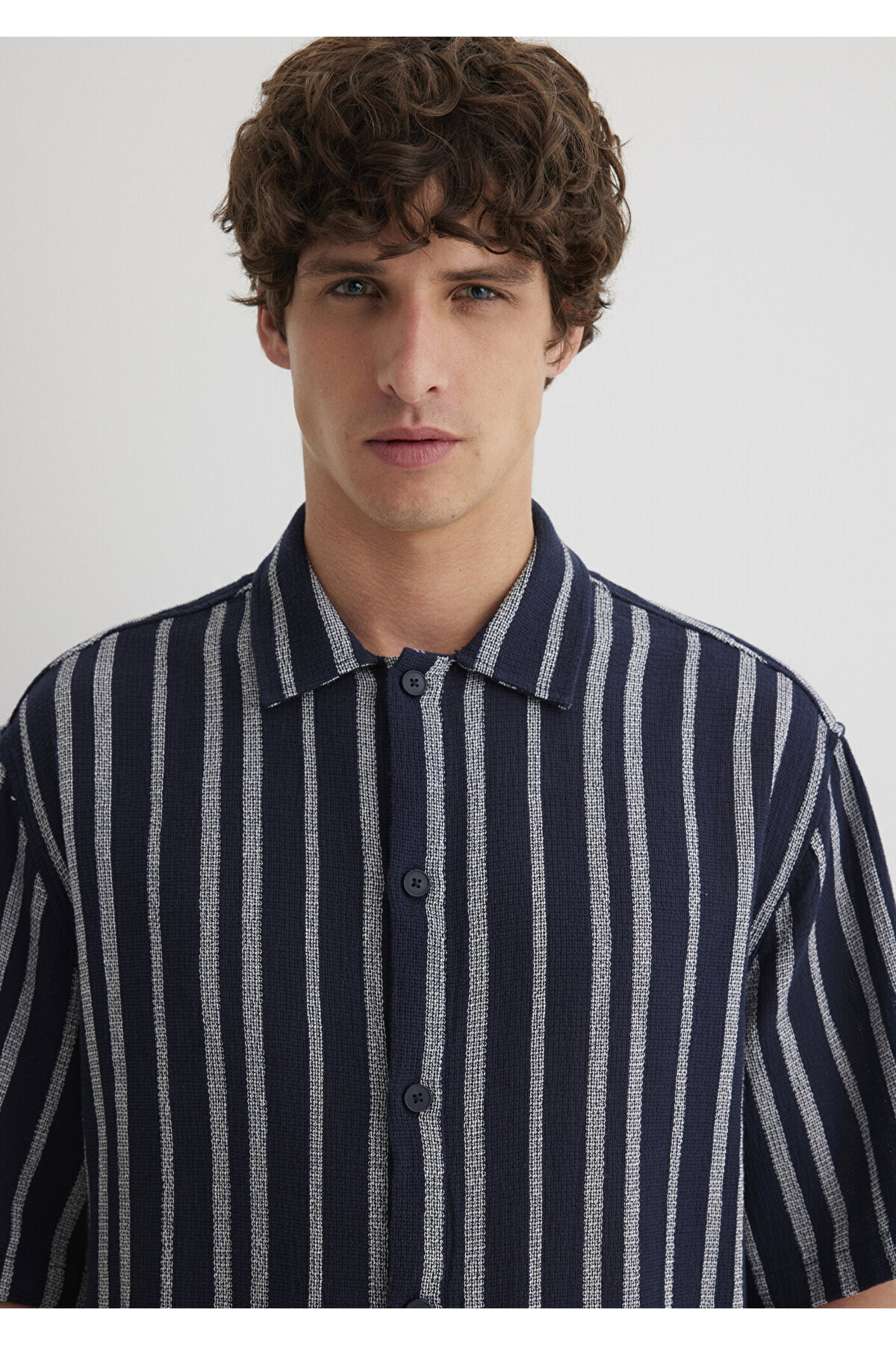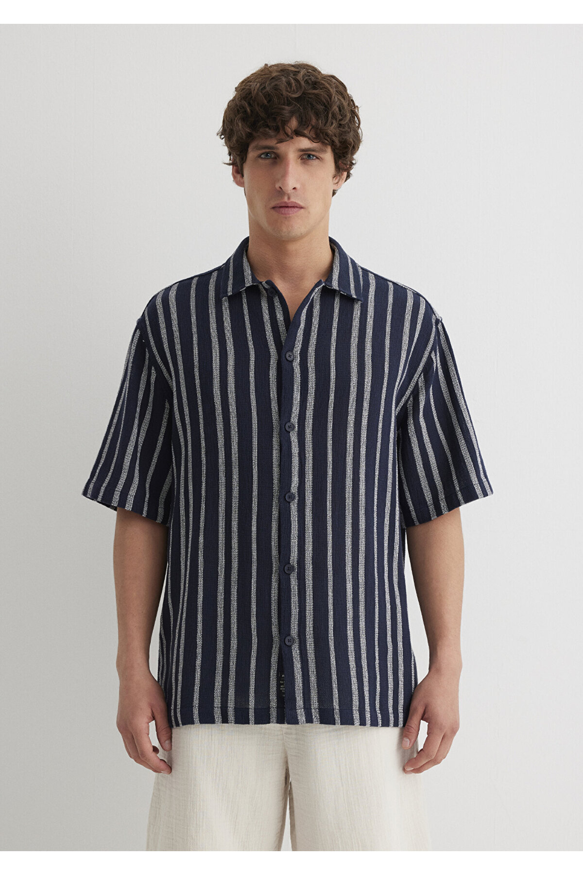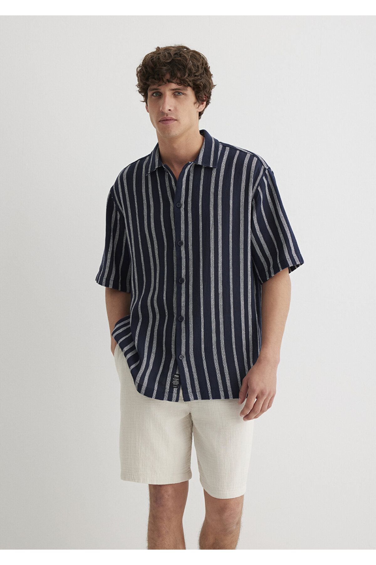 پیراهن آبی سرمه ای راه راه از مجموعه مردانه Mavi. تناسب گشاد / گشاد، برش راحت، آستین کوتاه. ابعاد مدل: قد: 185 سانتی متر / دور کمر: 72 سانتی متر / سینه: 92 سانتی متر / باسن: 91 سانتی متر. جنس: 100% پنبه. جنسیت: مرد. کمر: کمر معمولی. نوع پارچه: بافتنی. آستین: استاندارد. محل تولید: ترکیه.