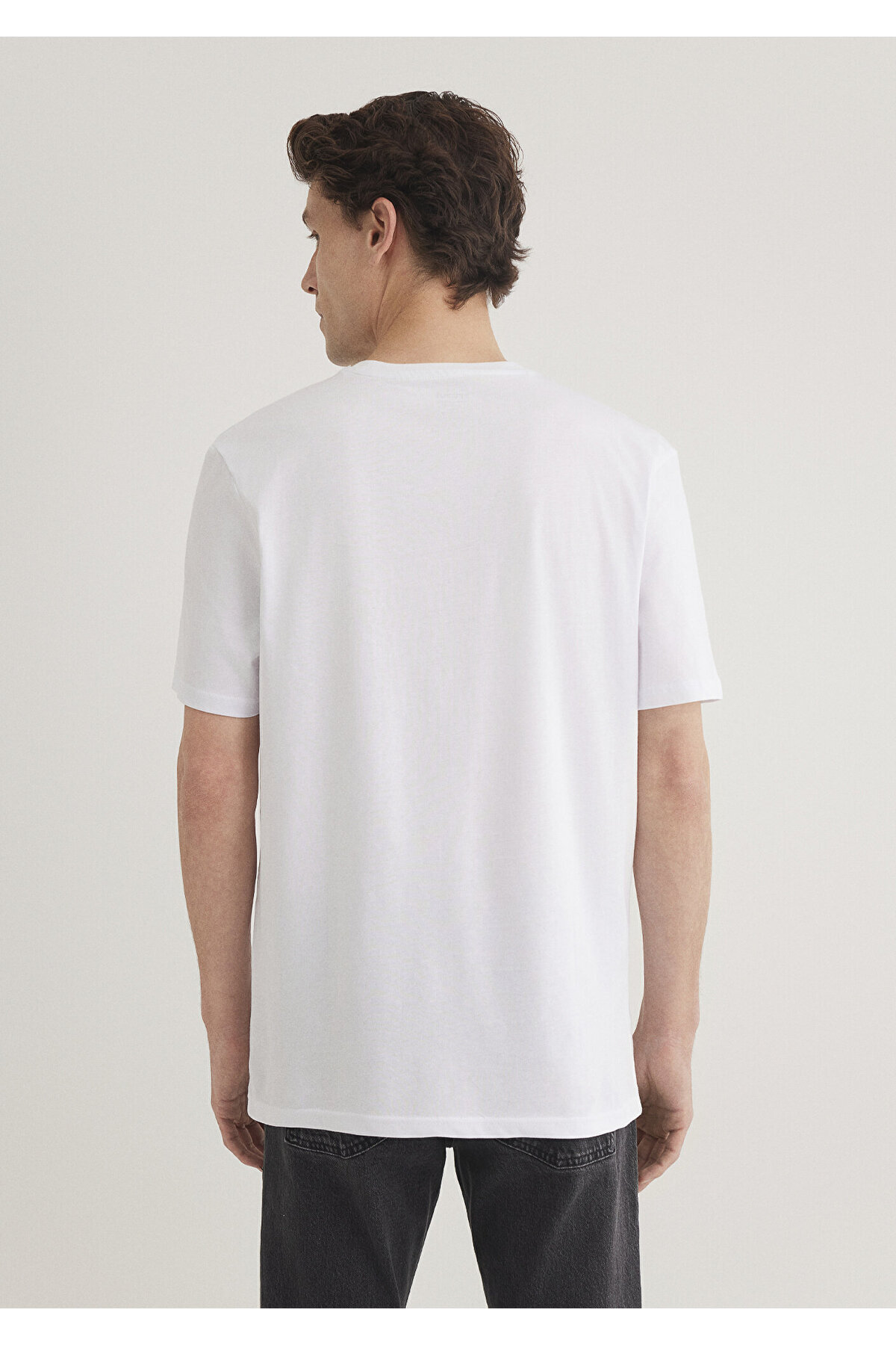 تی شرت سفید پرینت جین آبی از 100% پارچه پنبه ای متوسط ساخته شده است.