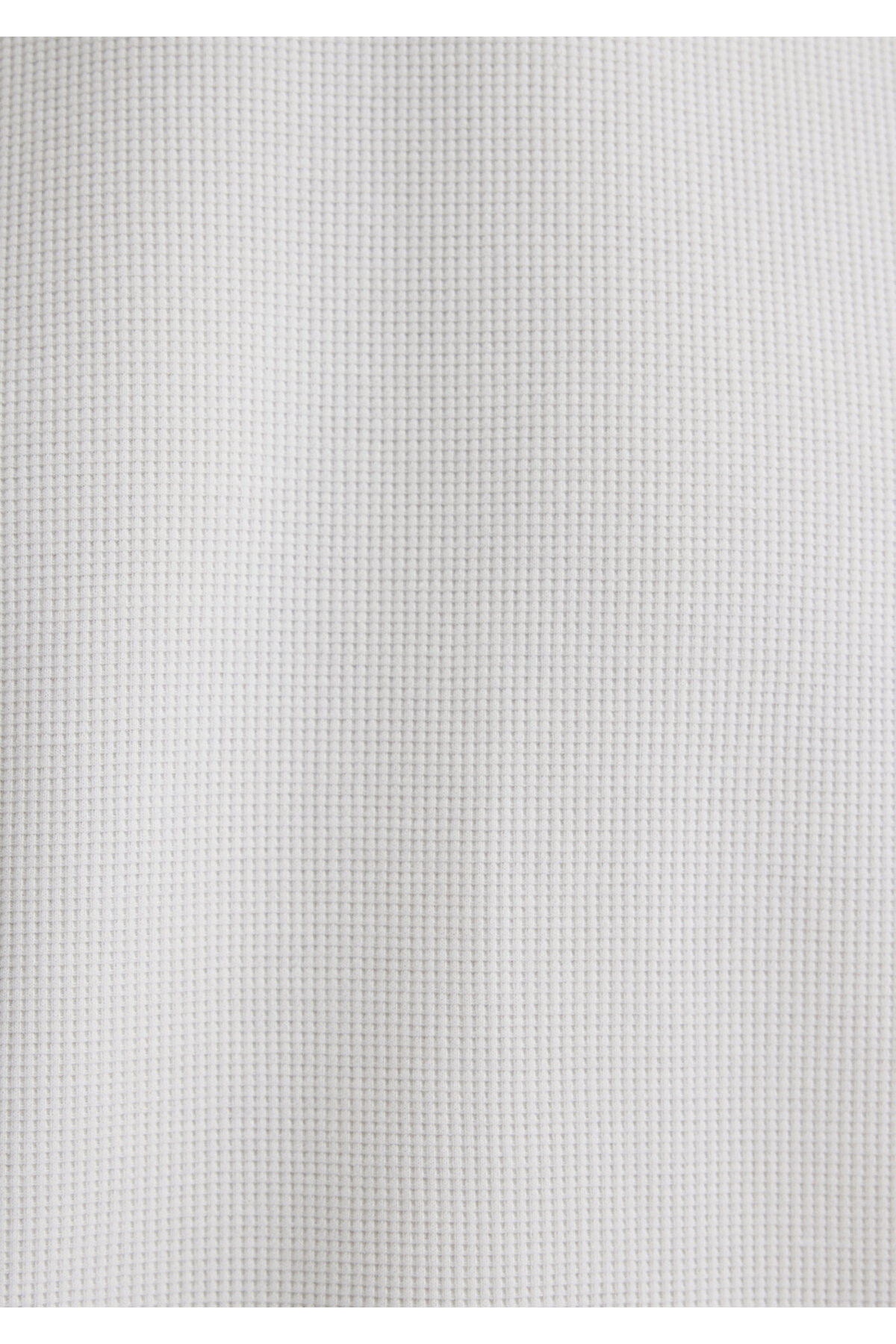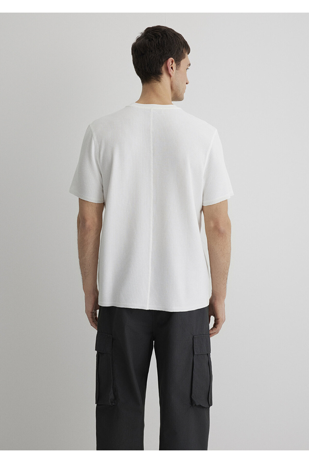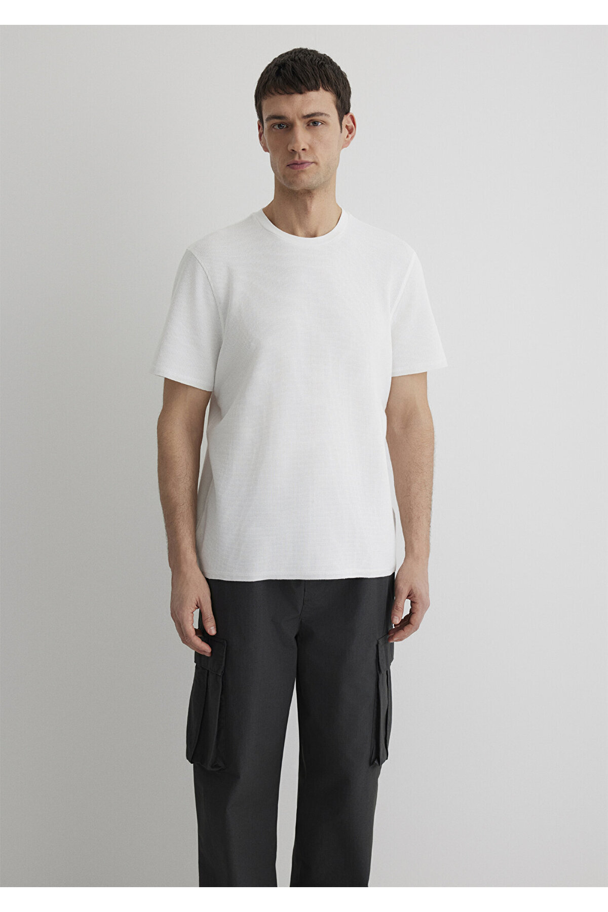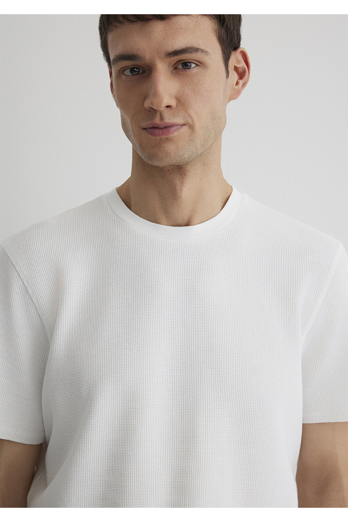 تی شرت بیسیک سفید بافت دار از پارچه وافل ترکیبی پنبه ای متوسط ساخته شده است.