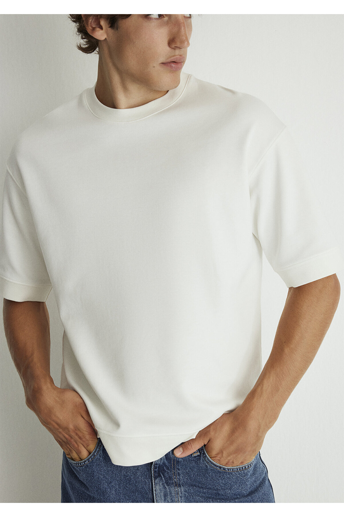 این تی شرت یقه سفید از پارچه پنبه ای با وزن متوسط ساخته شده است.