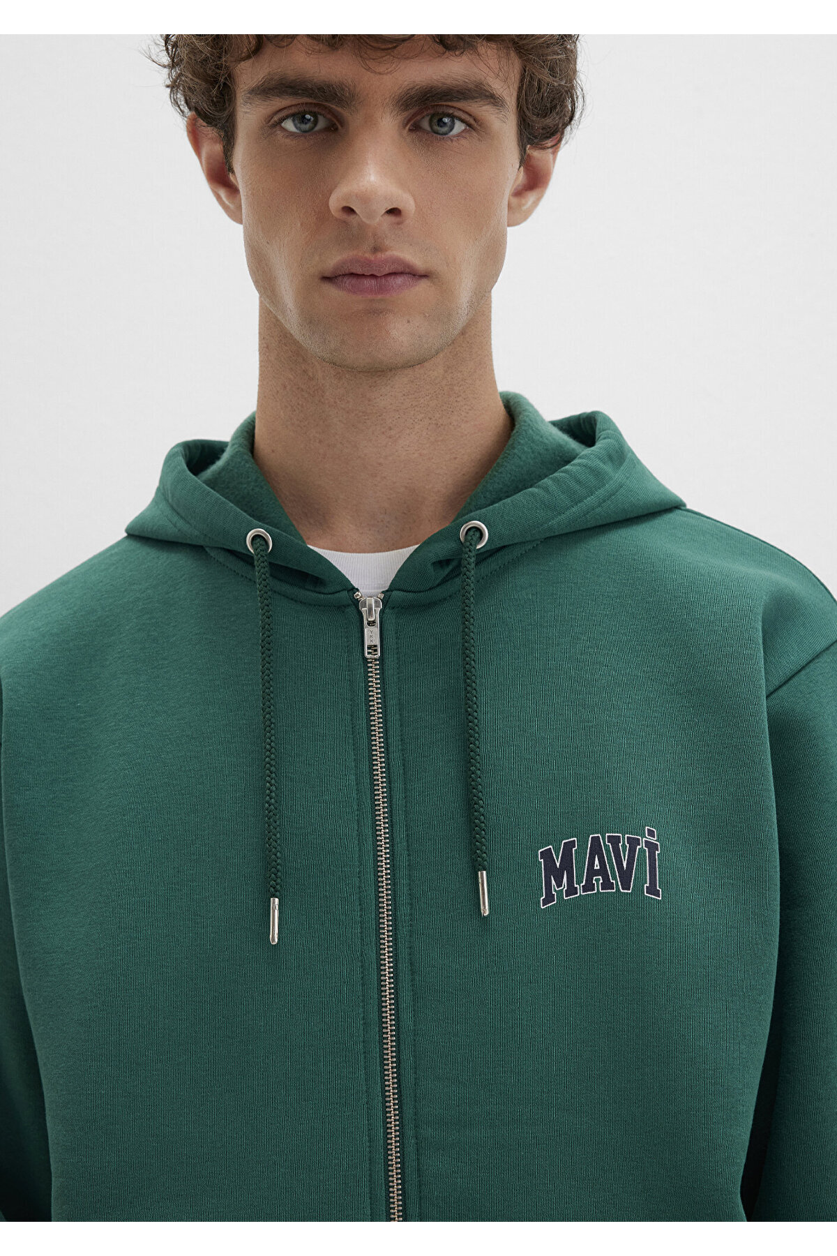 یک سویشرت سبز زیپ دار با چاپ لوگوی آبی از مجموعه مردانه Mavi.