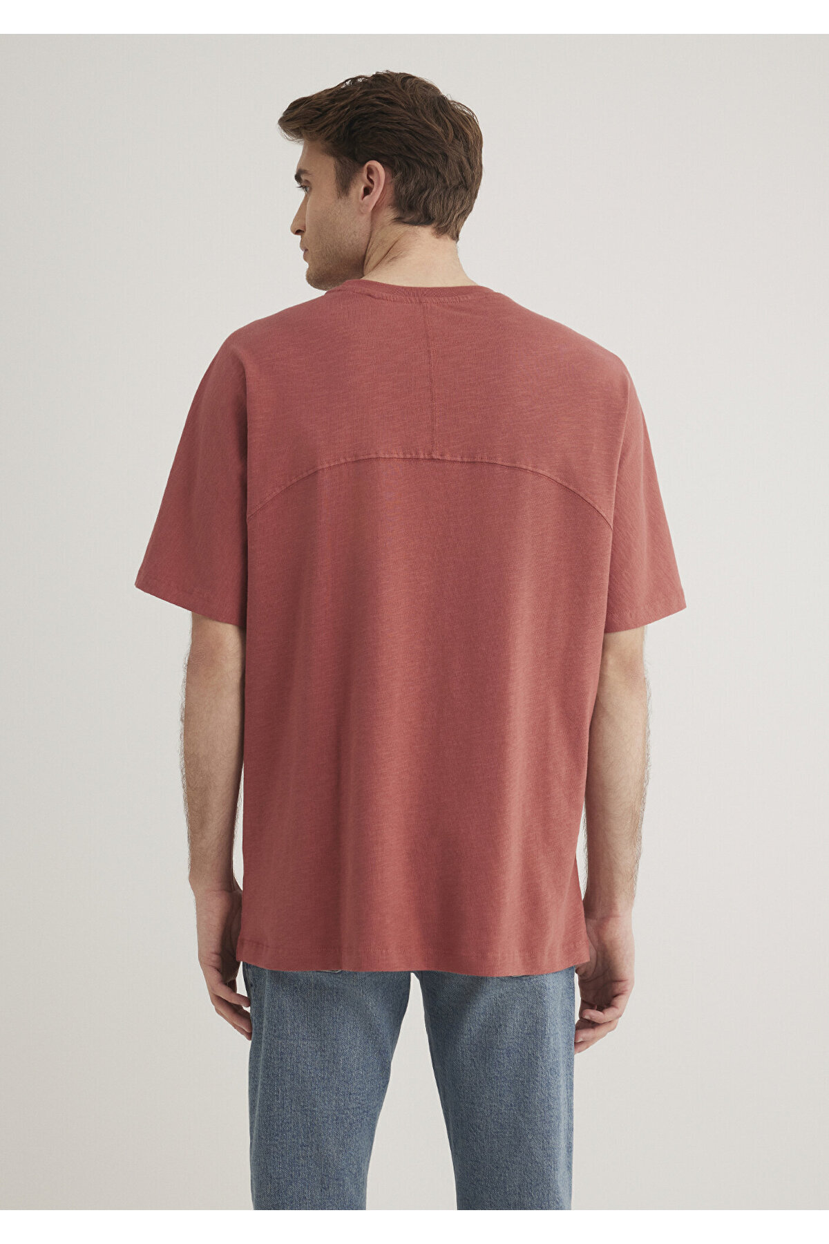 این تی شرت با طراحی آستین کوتاه و رنگ قرمز آجری خود را برجسته می کند و جزئیات دوخت پشت آن ظرافت ساده ای را به آن بخشیده است.
