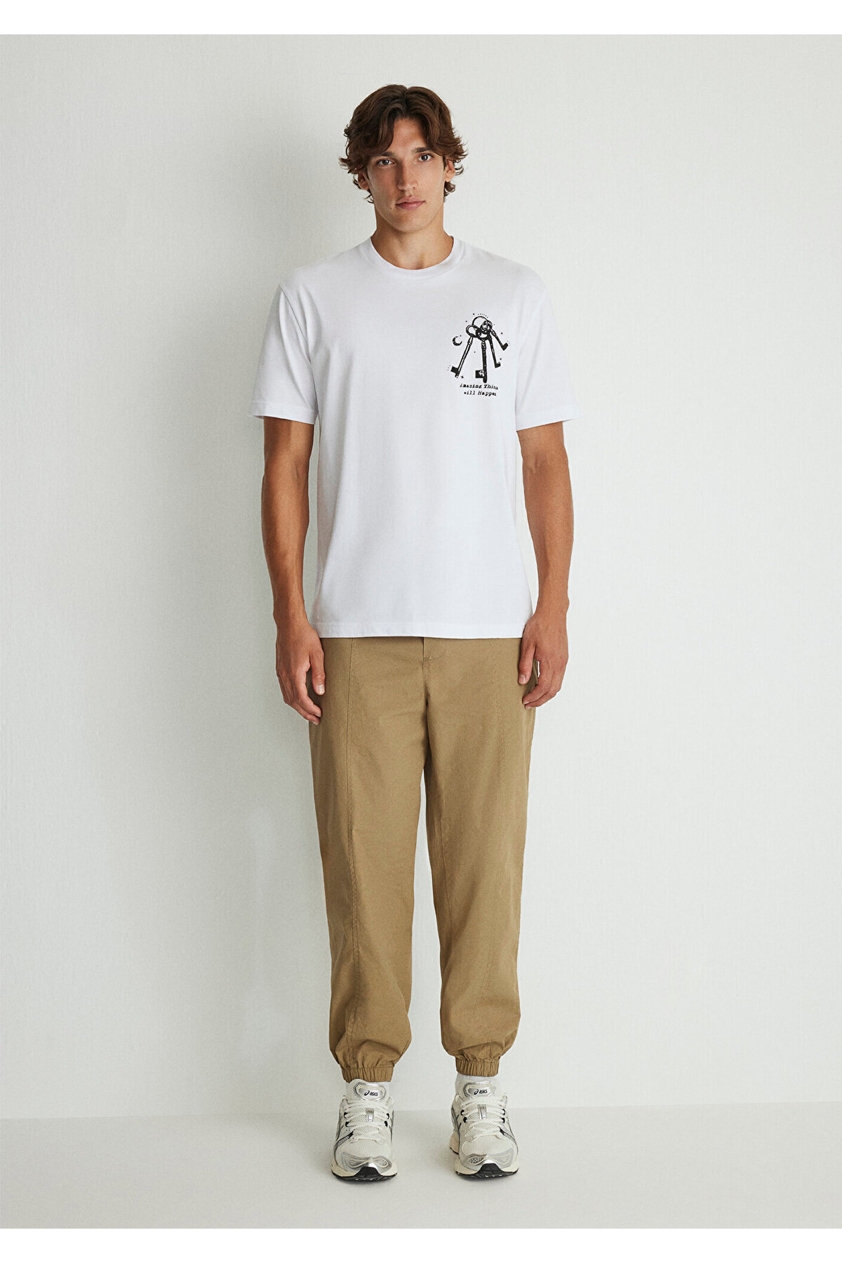 این تیشرت سفید با چاپ پشتی از پارچه 100% پنبه ای متوسط ساخته شده است.