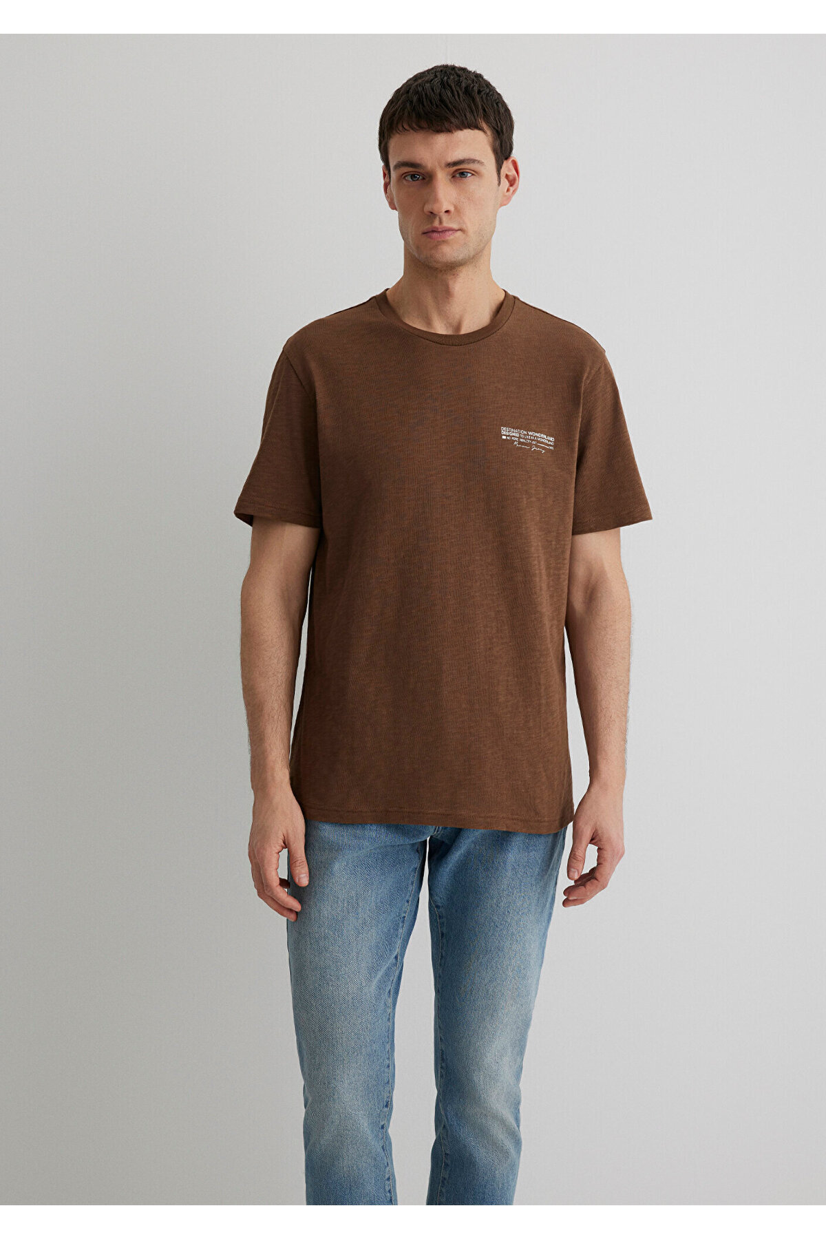 این تیشرت قهوه ای چاپ شده از 100% پنبه و پارچه متوسط ساخته شده است.