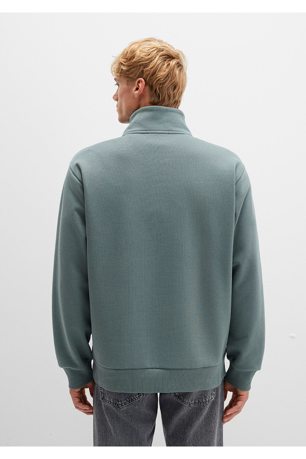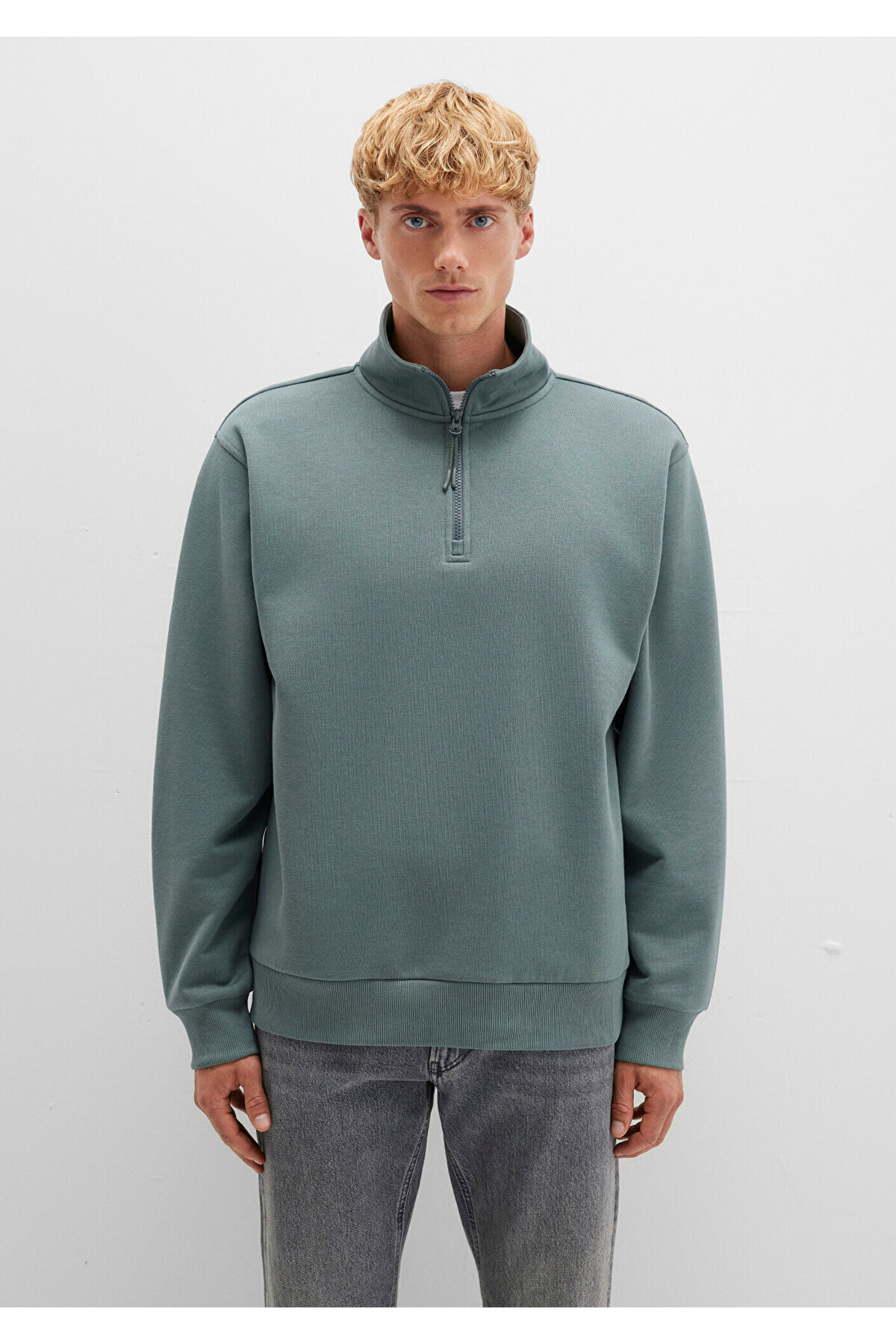 یک سویشرت ساده سبز با بسته شدن نیمه زیپ از مجموعه مردانه Mavi.