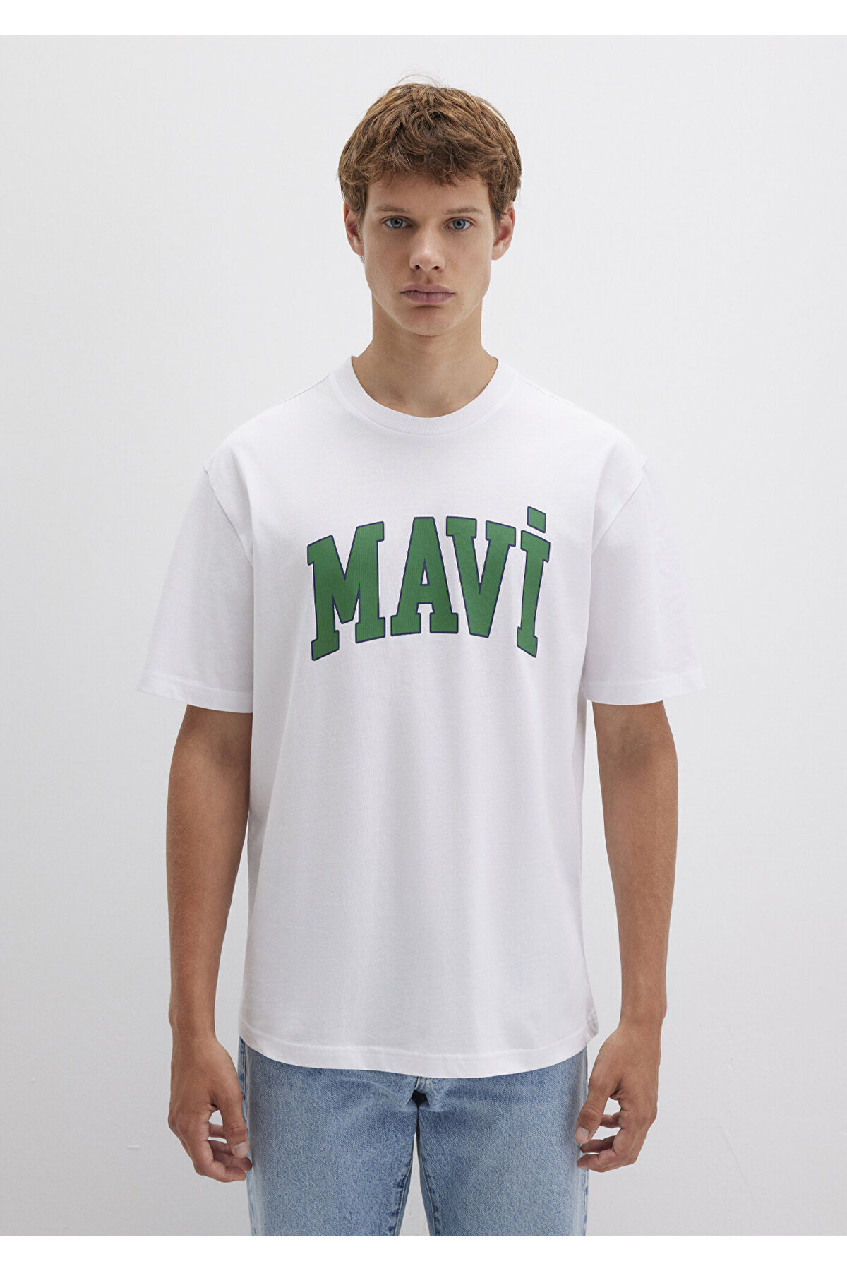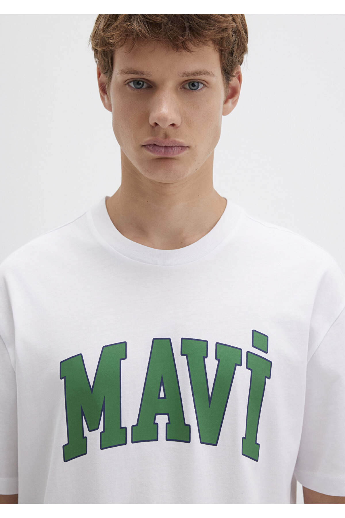 خرید اینترنتی تی شرت سفید چاپ شده با لوگو گشاد / برش راحت گشاد 0611711-620 برند ماوی Mavi اورجینال از Mavi نمایندگی ترکیه