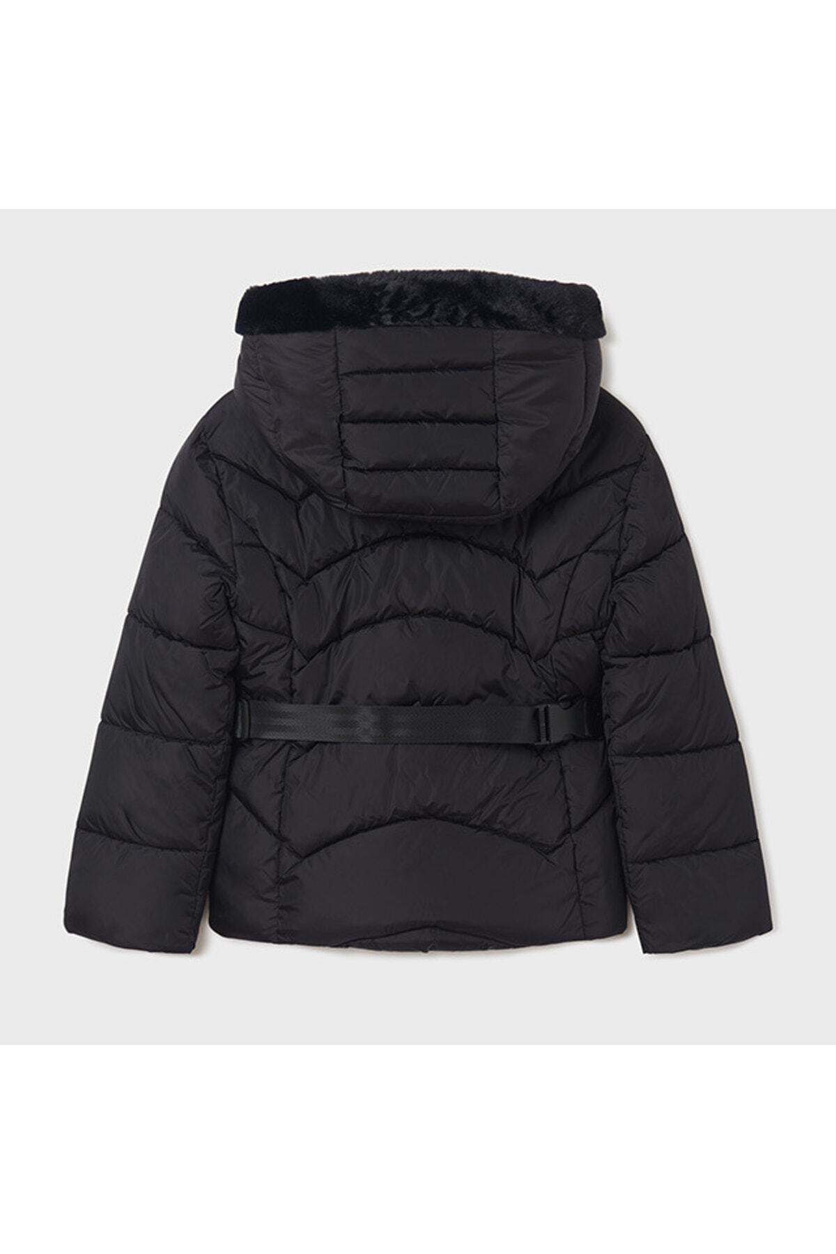 خرید اینترنتی پالتو دخترانه کلاه دار مشکی با کمر خزدار و کیف L23k7489 برند مایورال Mayoral اورجینال از likakids نمایندگی ترکیه