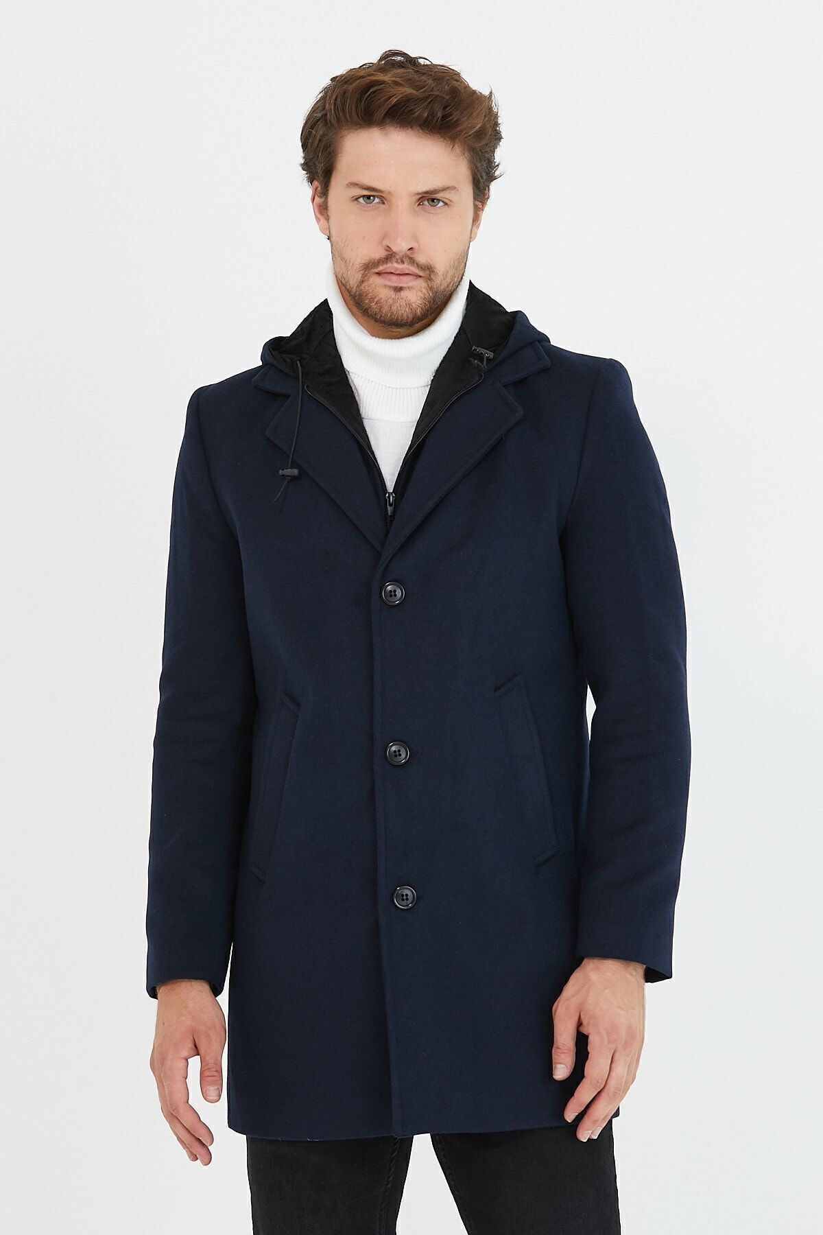خرید اینترنتی پالتو بلند مردانه کلاه دار پشمی سرمه ای ترکیبی کشمیری با زیپ و دکمه در جلو برند مرو لایف Mero Life اورجینال از MeroLife نمایندگی و فروشگاه معتبر ترکیه