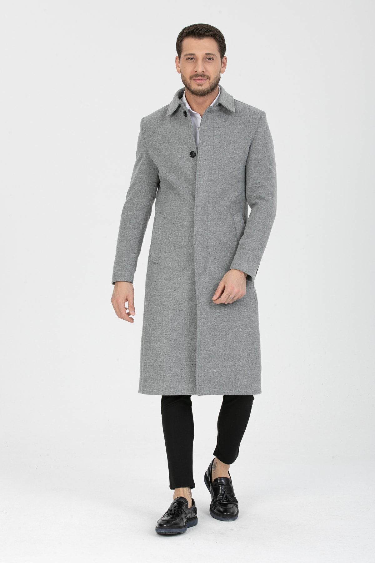 خرید اینترنتی پالتو و کت مردانه، پیراهن یقهدار بلند و باریک پشمی ترکیبی کشمیر به رنگ خاکستری روشن برند مرو لایف Mero Life اورجینال از MeroLife نمایندگی ترکیه